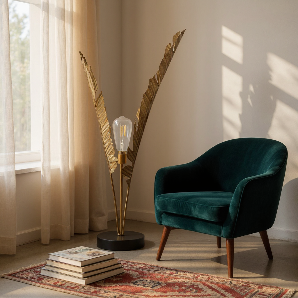 Questa lampada ha un design molto particolare: una lampada da tavolo con struttura in metallo dorato a forma di foglie tropicali che incorniciano la lampadina a vista, il tutto su una base nera rotonda. Un pezzo decorativo che unisce stile esotico e moderno, perfetto per salotti, camere o ambienti di design.