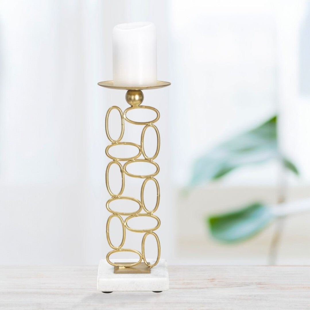 Portacandele in metallo dorato con base in marmo bianco dal design lineare e geometrico e dalle linee morbide e sinuose.