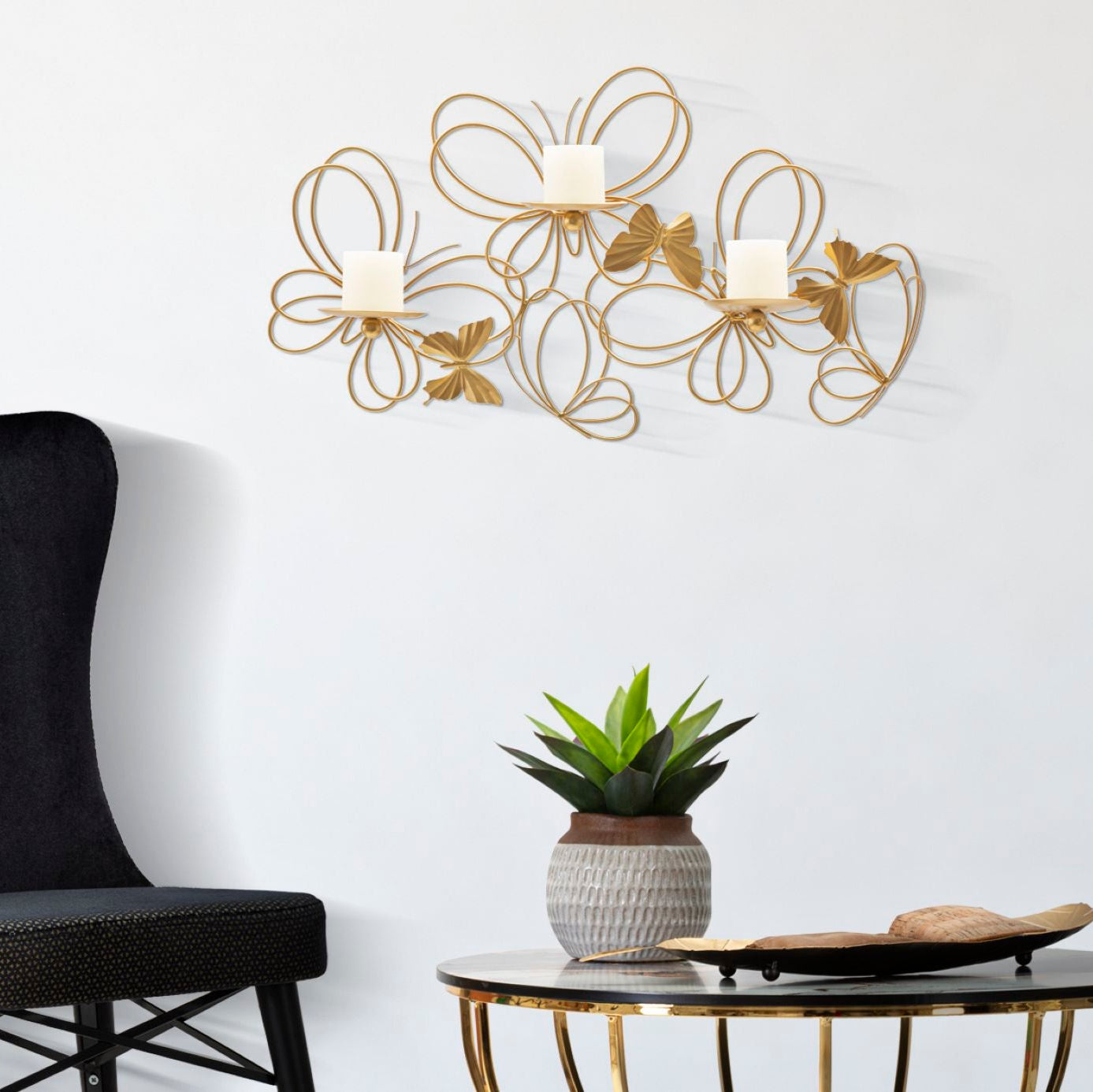 Portacandele da parete in metallo dorato con linee e decorazioni che compongono un insieme di farfalle in volo. Può contenere 3 candele.