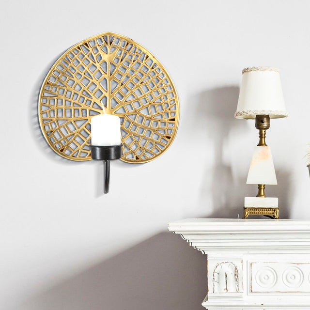 Elegante portacandele da parete in metallo dorato e nero a forma di foglia di loto. Un tocco esotico e glam per la tua casa.
