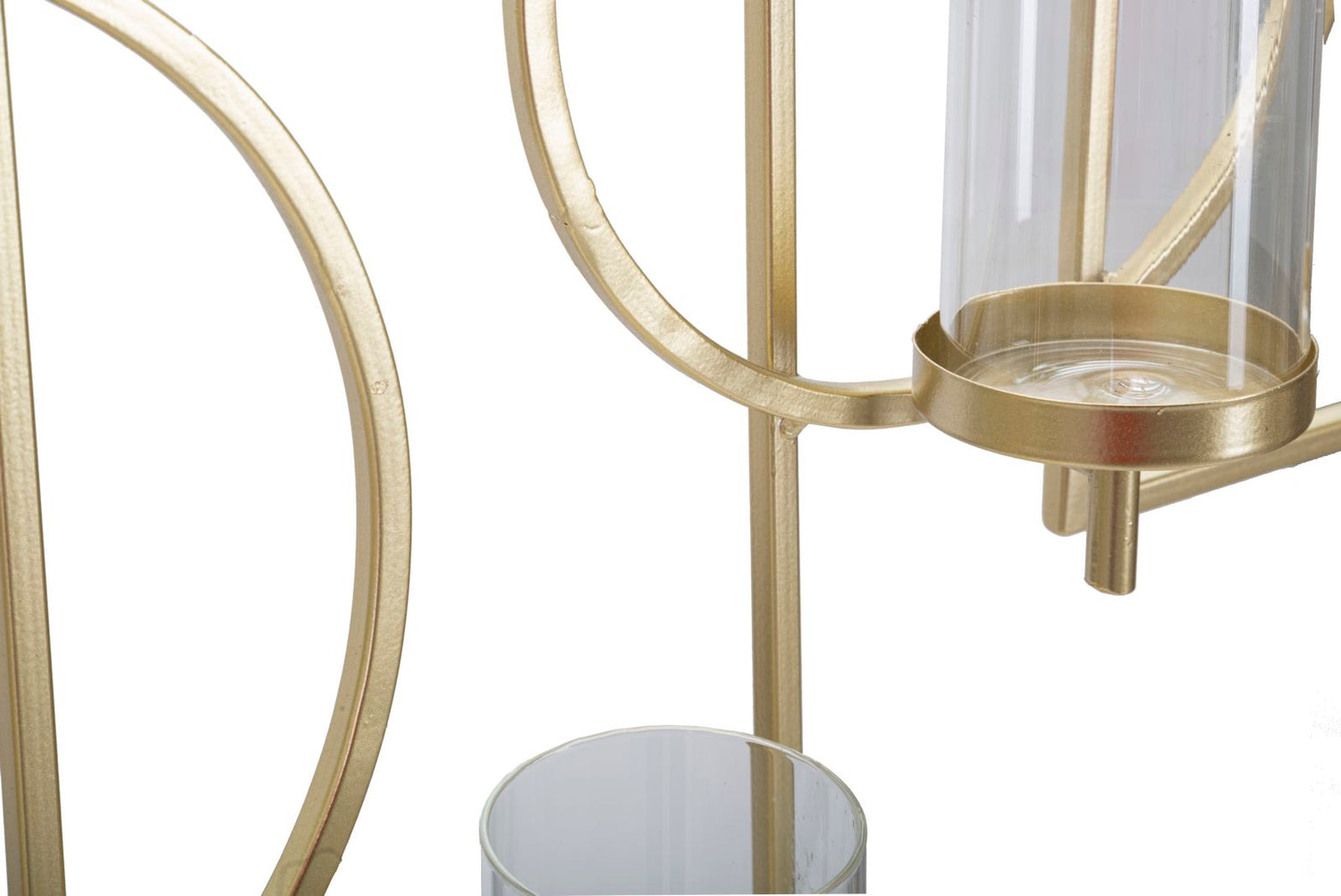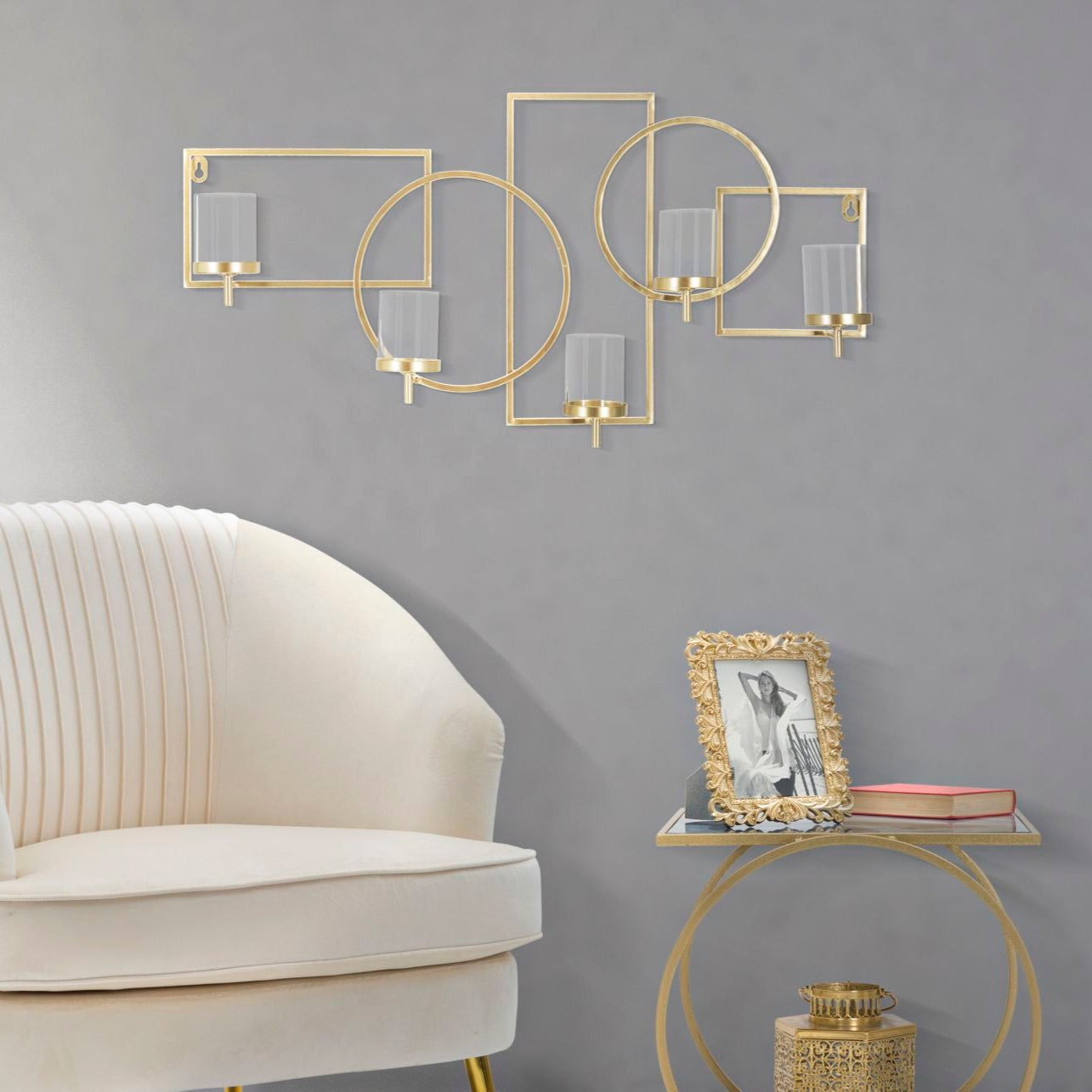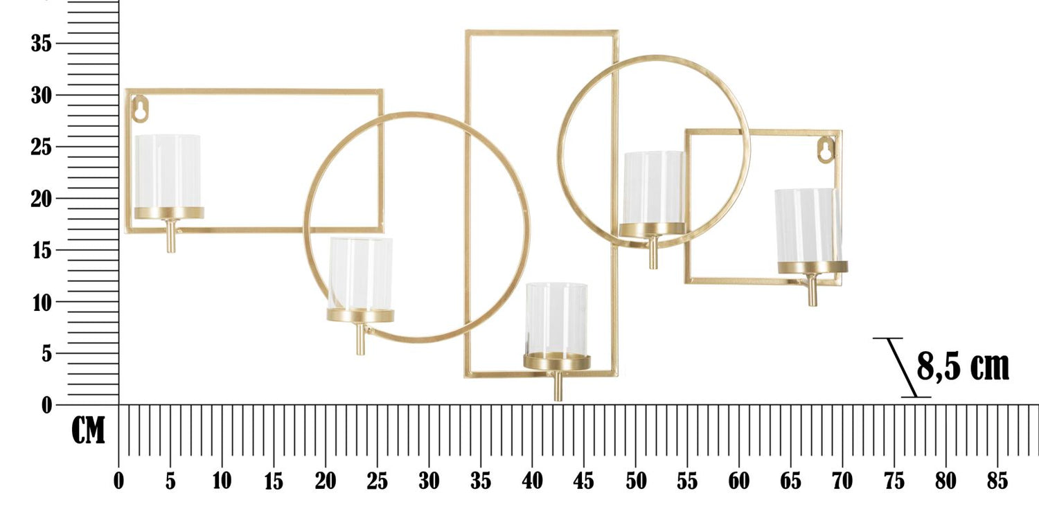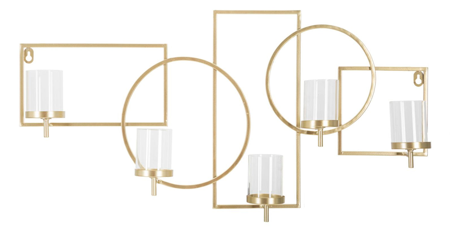 Portacandele da parete in metallo dorato dal design geometrico composto da cerchi e rettangoli. E' composto da 5 bicchierini porta candela in vetro.