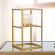 Portacandele in metallo dorato con bicchierino in vetro dalla struttura geometricamente squadrata e lineare.