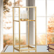 Portacandele in metallo dorato con bicchierino in vetro dalla struttura geometricamente squadrata e lineare.