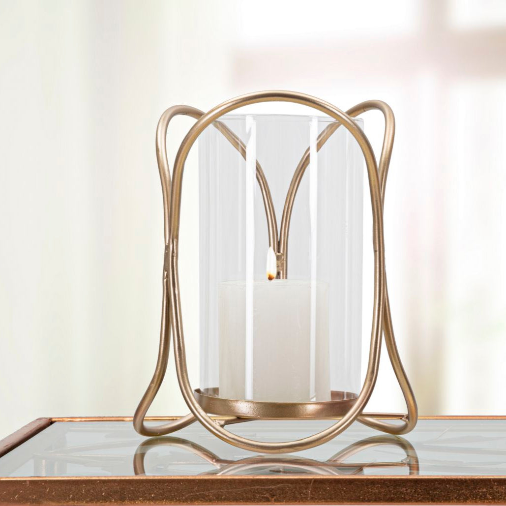 Portacandele in metallo dorato con bicchierino in vetro dal design geometrico e dalle linee morbide e sinuose.