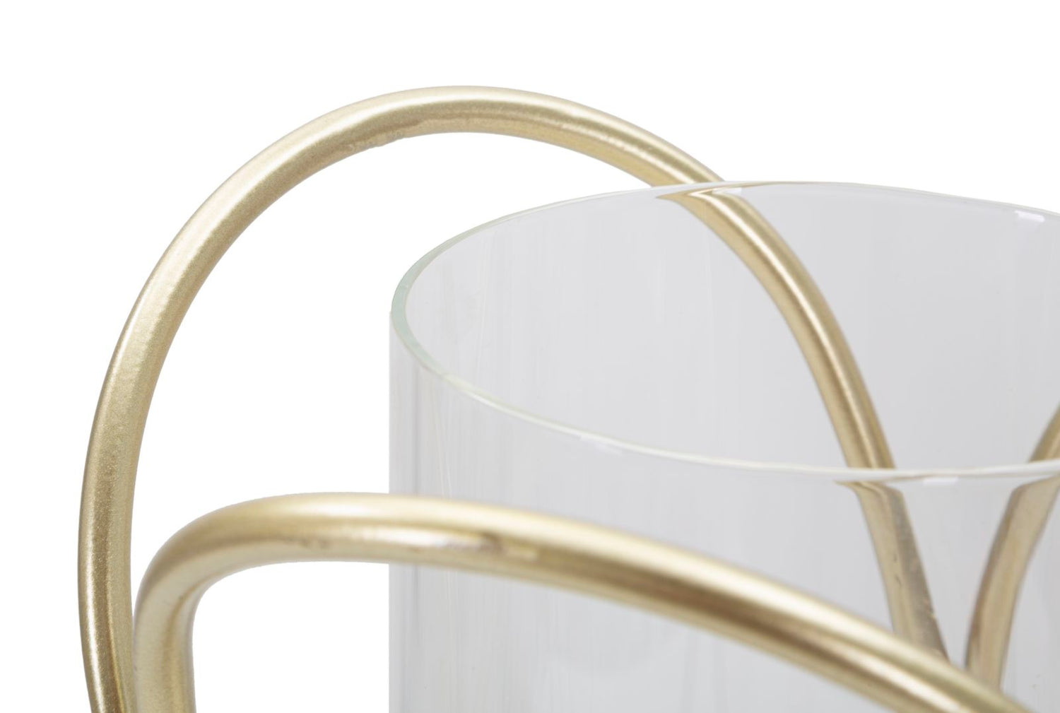 Portacandele in metallo dorato con bicchierino in vetro dal design geometrico e dalle linee morbide e sinuose.