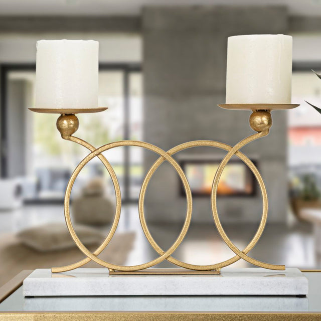 Portacandele in metallo dorato con base in marmo bianco. La struttura geometrica è composta da cerchi e semicerchi che si intersecano tra loro. Può contenere 2 candele.