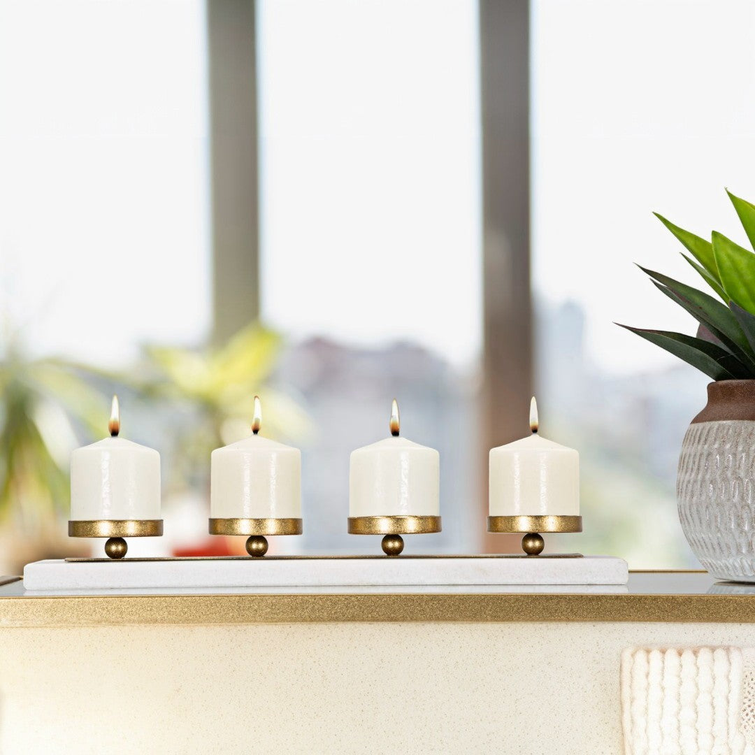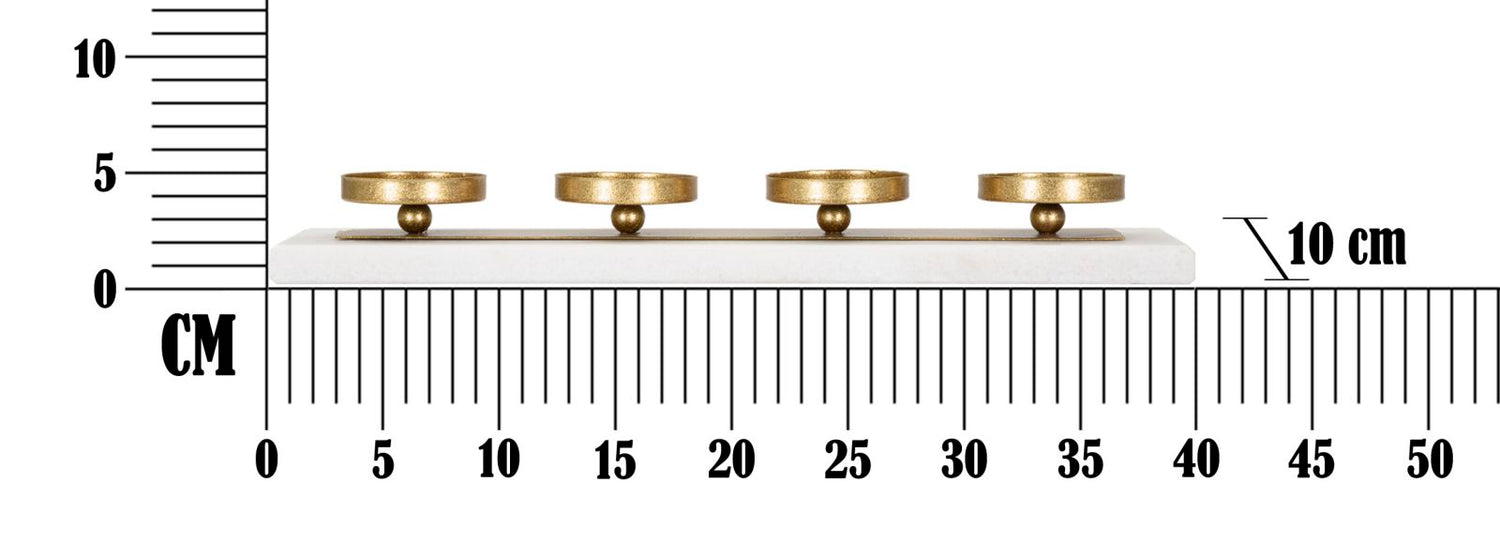 Portacandele rettangolare in metallo dorato con base in marmo bianco dalla linea semplice ed essenziale. Può contenere 4 candele.