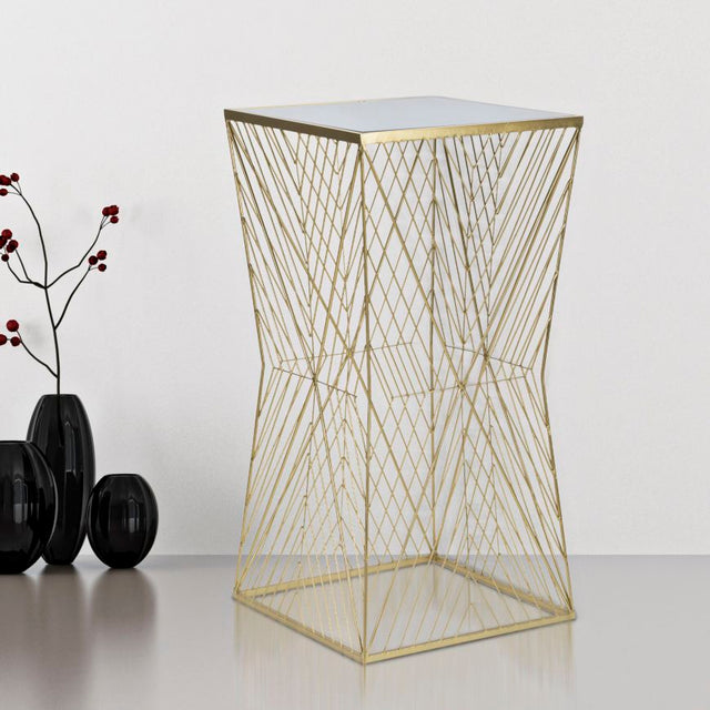 Tavolo portatelefono quadrato in metallo dorato dalle linee geometriche che creano un perfetto intreccio. Completo di piano in vetro a specchio.