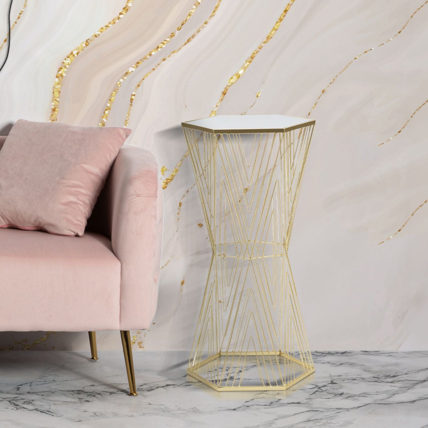 Tavolo portatelefono esagonale in metallo dorato dalle linee geometriche che creano un perfetto decoro. Completo di piano in vetro a specchio.