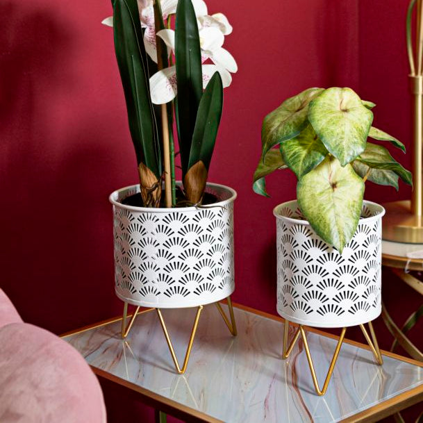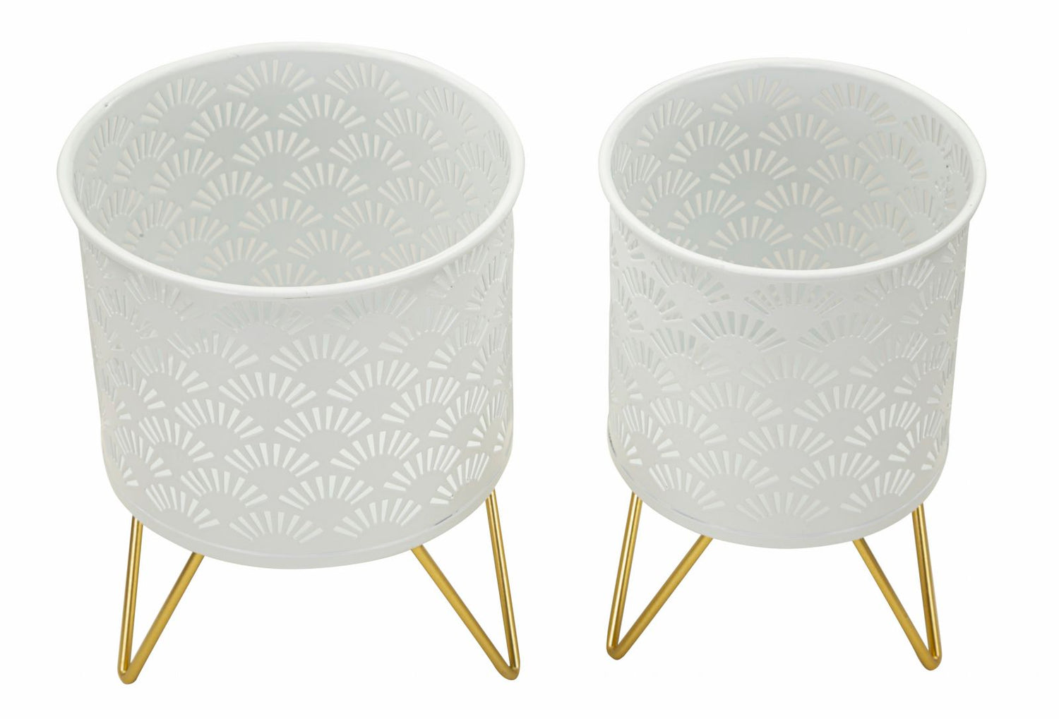 Coppia di portavasi in metallo bianco elegantemente decorati con intagli geometrici regolari. Completi di supporto in metallo dorato. I vasi sono removibili dai supporti.
