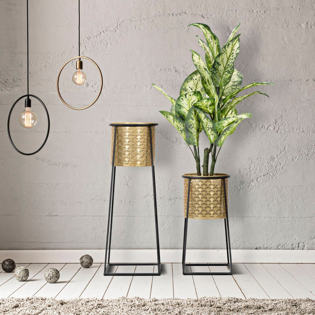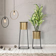 P/VASI COPPIA CUP - Elegante coppia di portavasi rotondi in metallo dorato intagliato con base in metallo nero. I portavasi sono rimovibili. Linee essenziali e intagli geometrici regalano un tocco di luce ed eleganza.