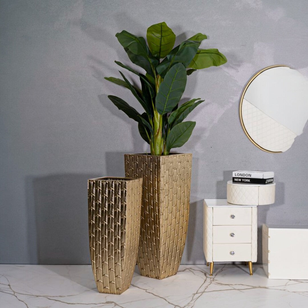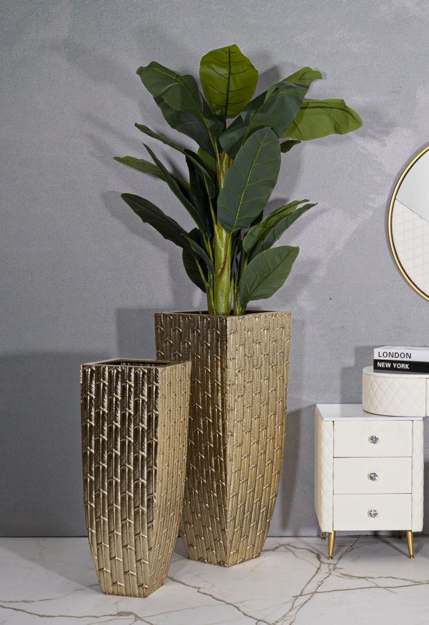 Set di 2 eleganti vasi dorati, con trama geometrica in rilievo perfetti per decorare ogni ambiente con stile e raffinatezza. Ideali per piante o come elementi decorativi singoli.