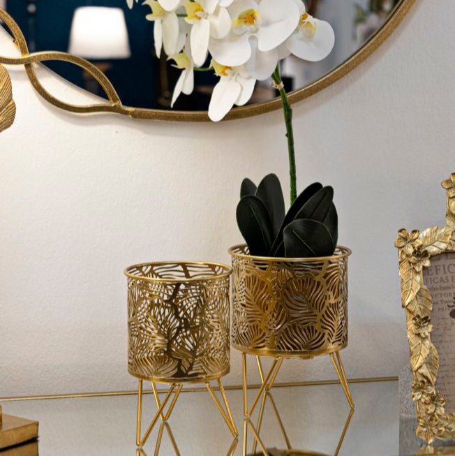Coppia di portavasi in metallo dorato elegantemente decorati con intagli che richiamano le foglie. Completi di supporto in metallo dorato. I vasi sono removibili dai supporti.