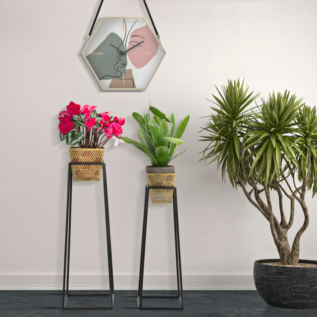 P/VASI SQUARE COPPIA - Coppia di portavasi in metallo dorato finemente intagliato con piedistalli in metallo nero. Le linee morbide e sinuose donano un tocco di armonia ad ogni ambiente.