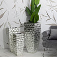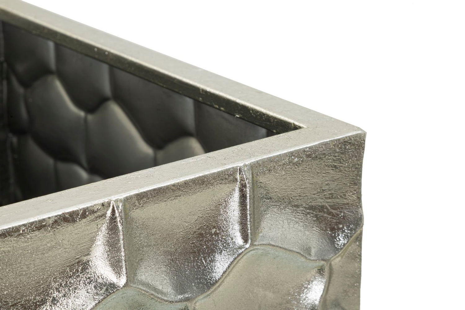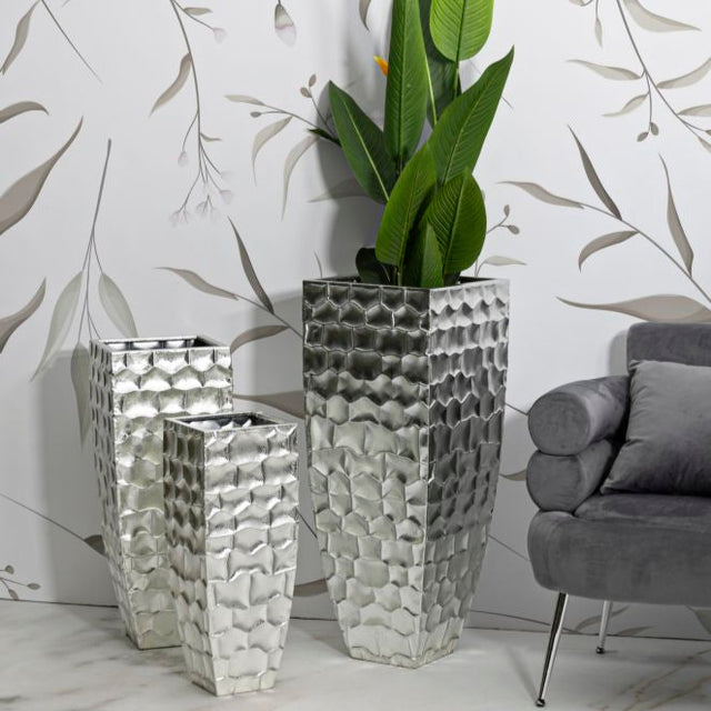 Set di 3 vasi quadrati in metallo argentato con eleganti decorazioni irregolari in rilievo.