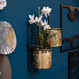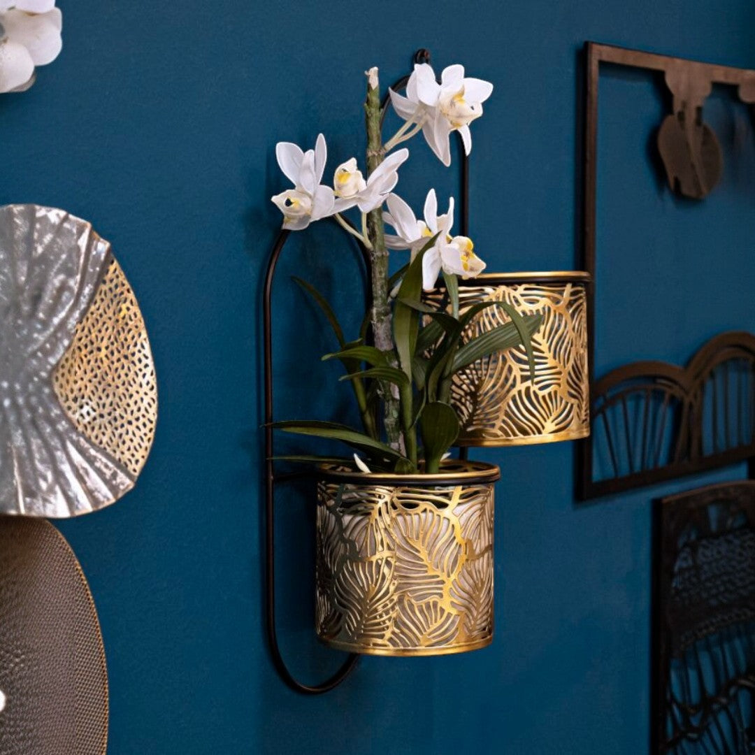 Portavasi da parete doppio in metallo dorato finemente intagliato con decorazioni che ricordano delle foglie e supporto in metallo nero. I vasi sono removibili.