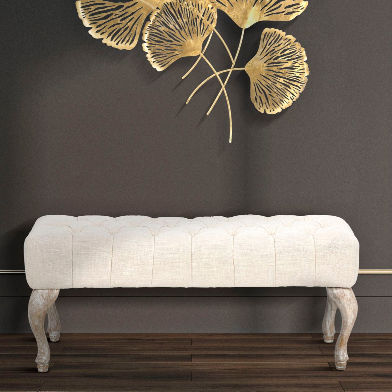 PANCHETTA PROVENZA - Panca in legno e tessuto. Lo stile shabby chic nasce nelle case di campagne inglesi per poi conquistare un ruolo di primo piano nell’arredo a partire dagli anni’80. Panche nei toni dello champagne e del bianco realizzate in tessuto semigrezzo e legno interpretano ad arte questo stile.