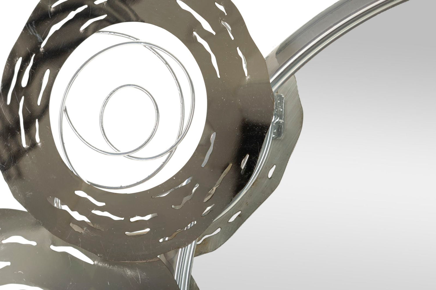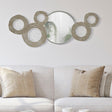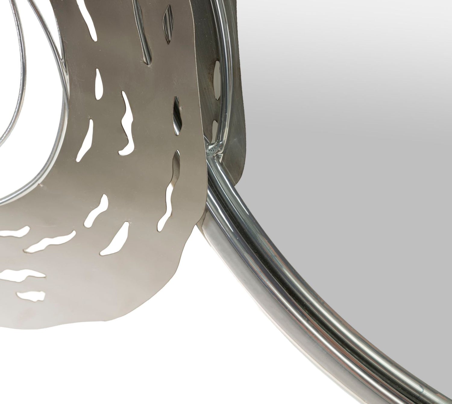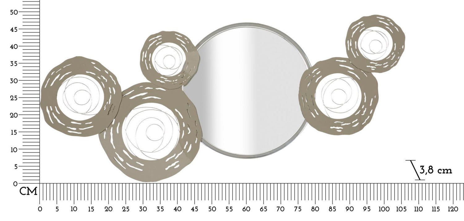 Pannello decorativo 3D da parete in metallo argento con cerchi che sembrano giocare con la luce, lo specchio aggiunge un tocco di modernità all'ambiente.