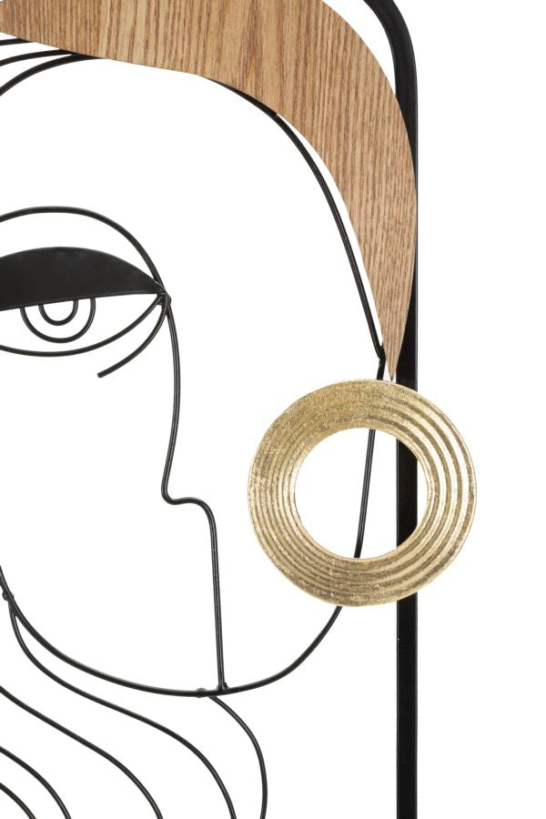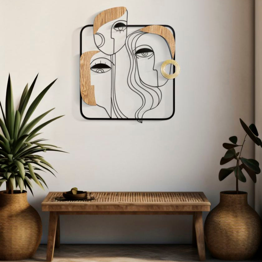 Pannello decorativo 3D da parete in metallo e legno raffigurante dei volti dai tratti che richiamano l'arte cubista.