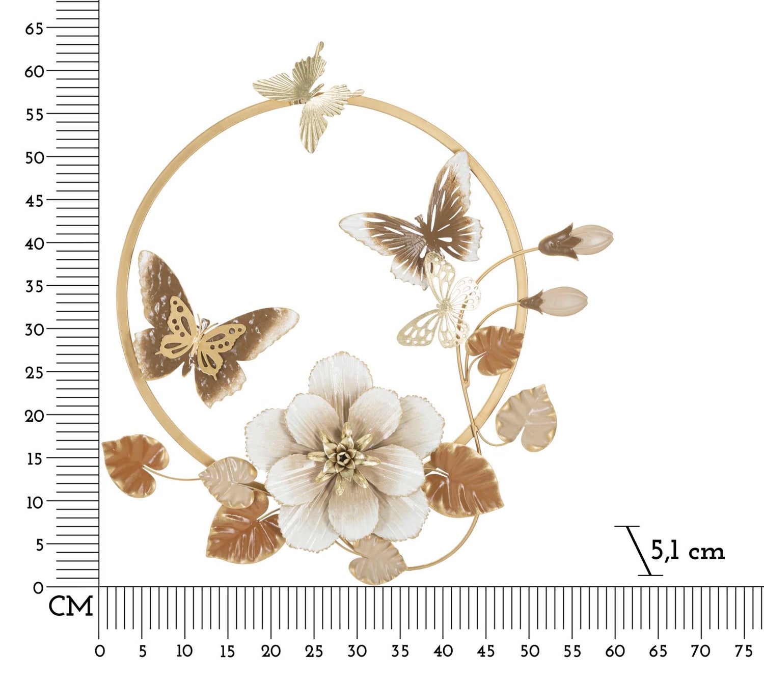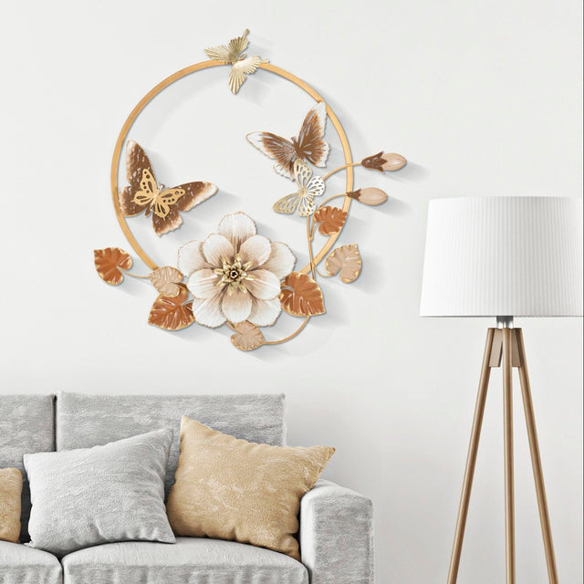 Un elegante quadro da parete in metallo che unisce la delicatezza delle farfalle alla bellezza di un fiore centrale tridimensionale. I toni oro, beige e marrone lo rendono perfetto per donare calore e raffinatezza agli ambienti moderni e classici.