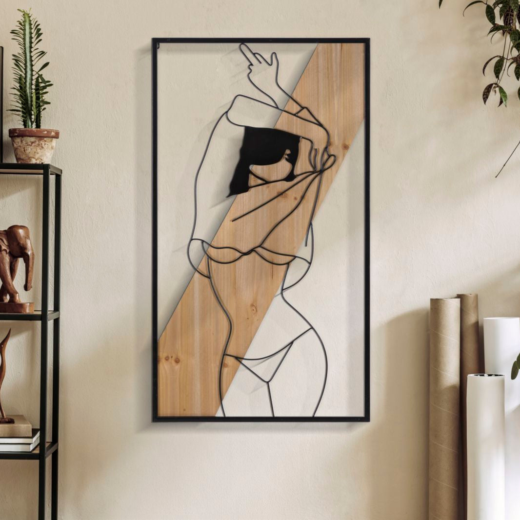 Pannello decorativo 3D da parete in metallo e legno raffigurante una ragazza che si spoglia.