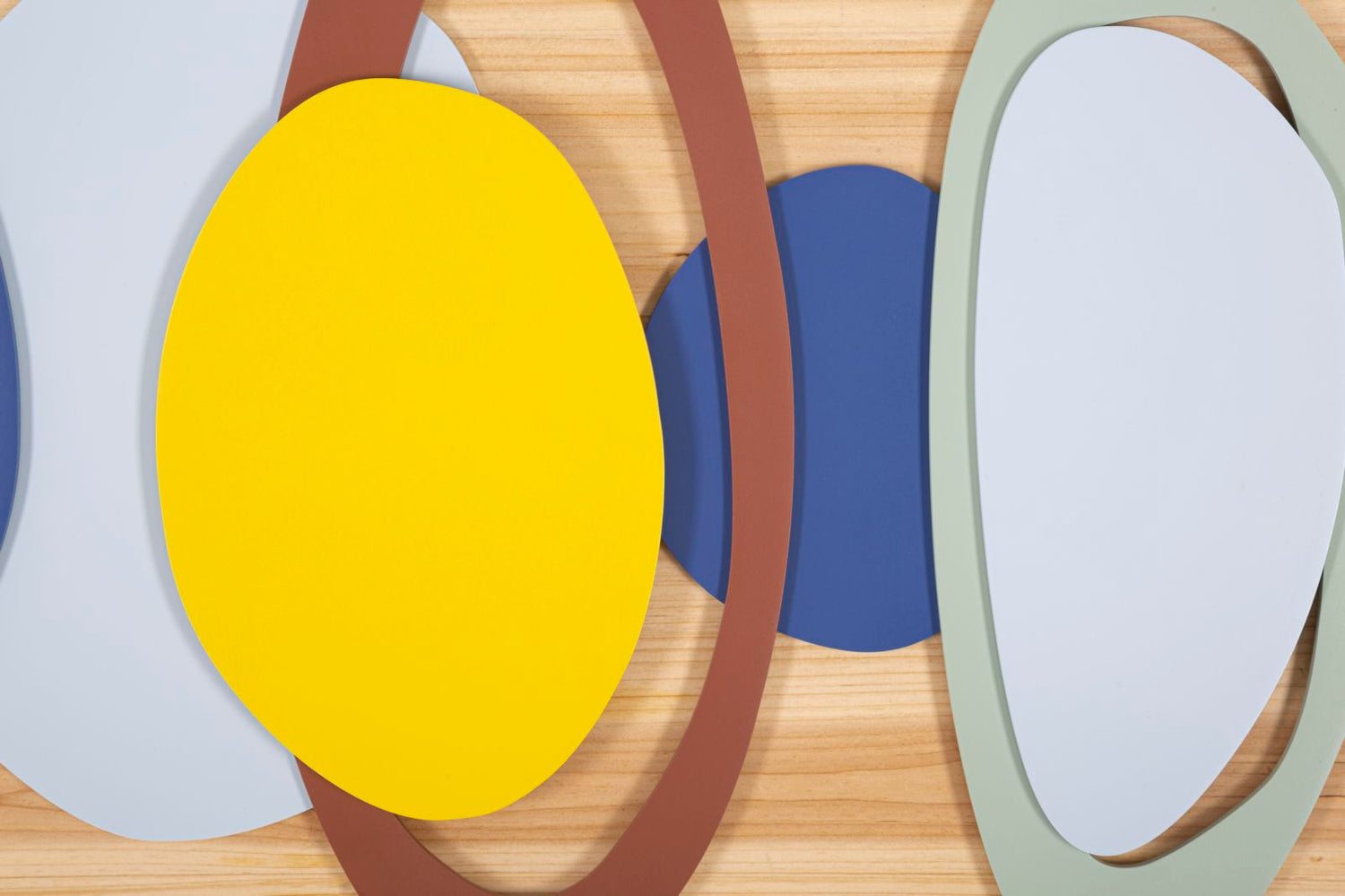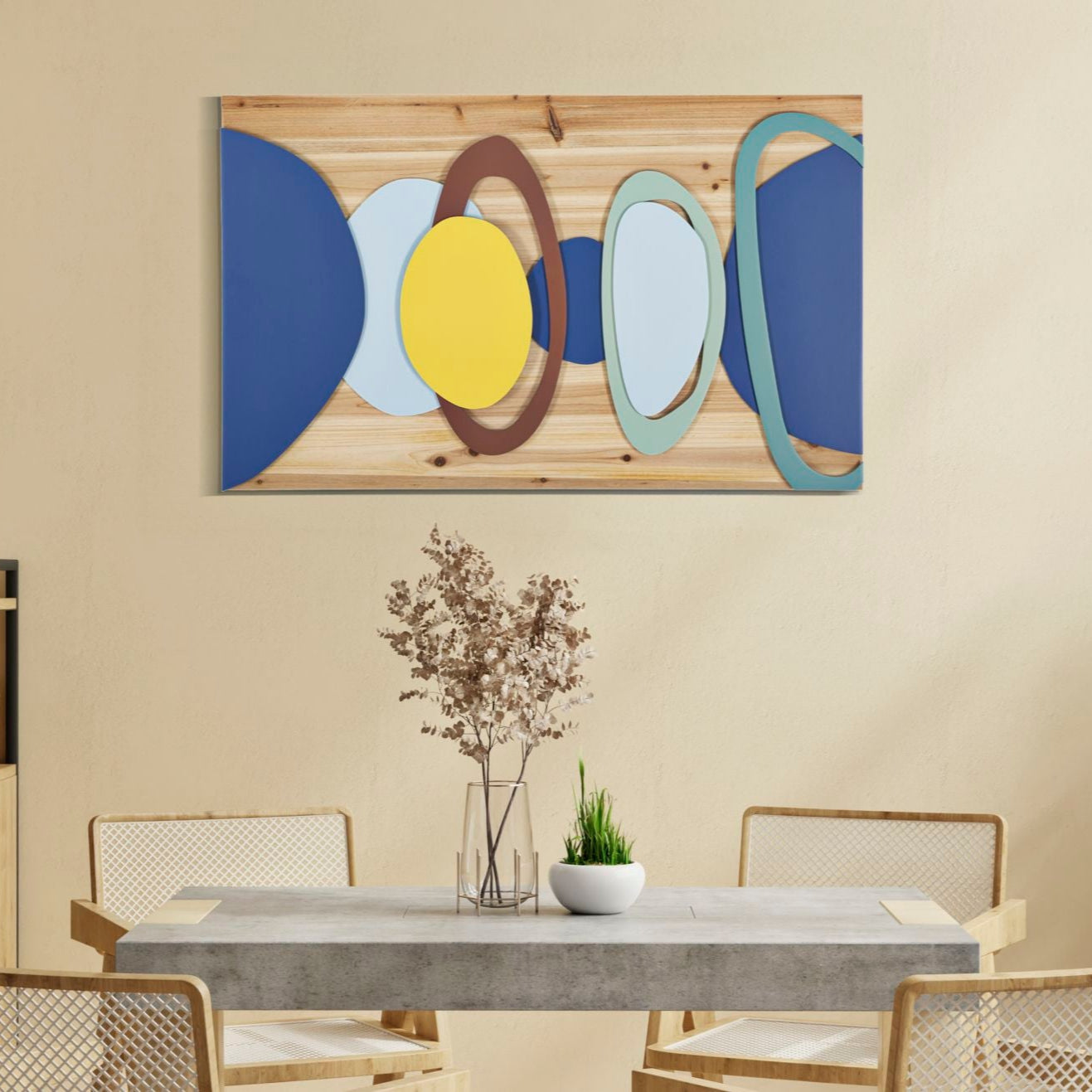 Pannello decorativo 3D da parete in metallo e legno composto da figure geometriche arrotondate. I colori accesi donano un tocco di luminosità ad ogni stanza della casa.