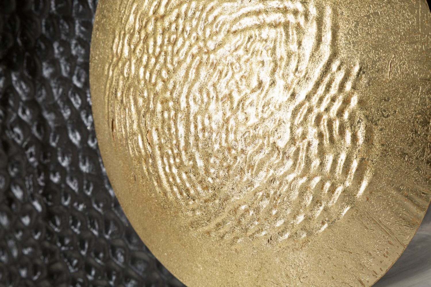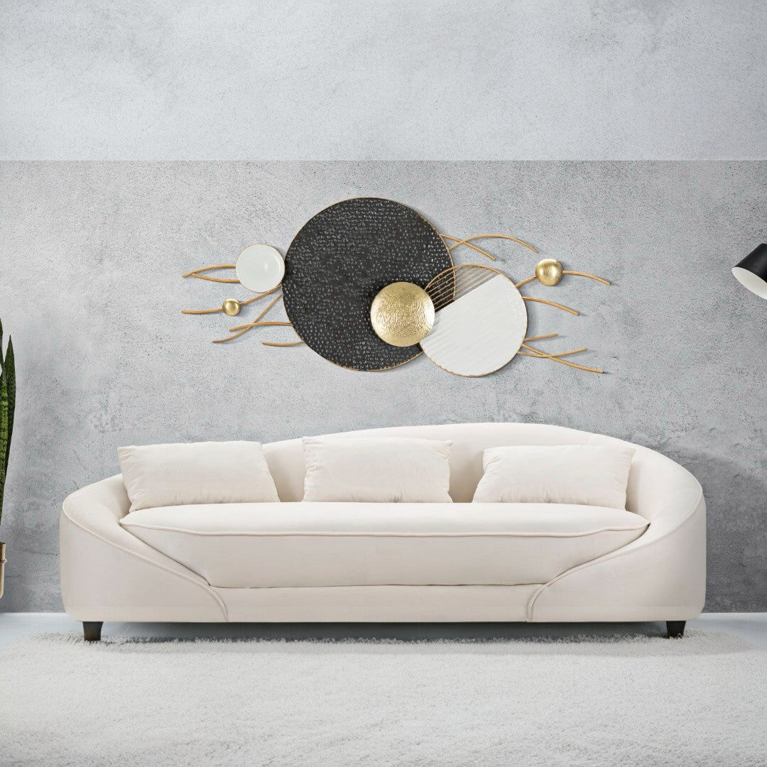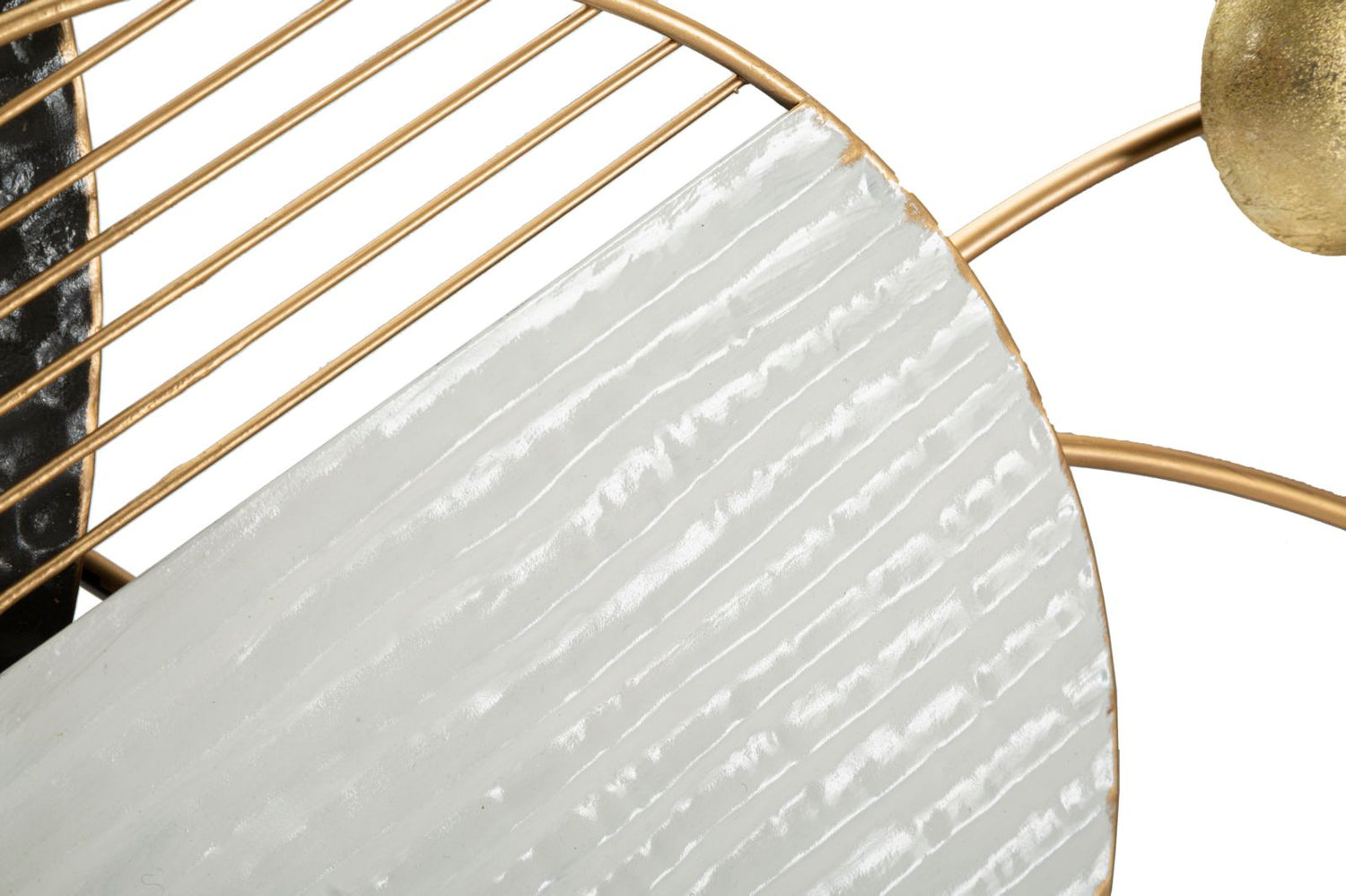 Un’opera dal carattere contemporaneo: questo quadro decorativo in metallo unisce forme circolari e linee dinamiche, creando un gioco visivo elegante e sofisticato. Le tonalità nero, bianco e oro donano luminosità e carattere a qualsiasi ambiente, rendendolo perfetto per soggiorni, ingressi o camere dal design moderno.
