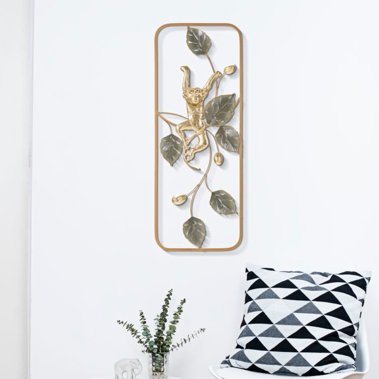 Pannello decorativo 3D da parete in metallo composto da una scimmia dorata su rami con foglie verdi in un'elegante cornice rettangolare con gli angoli smussati.