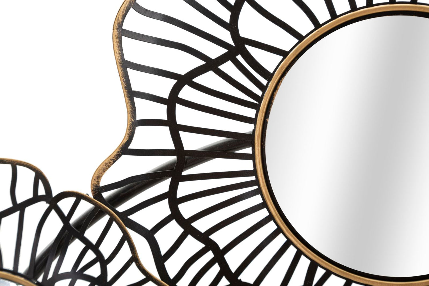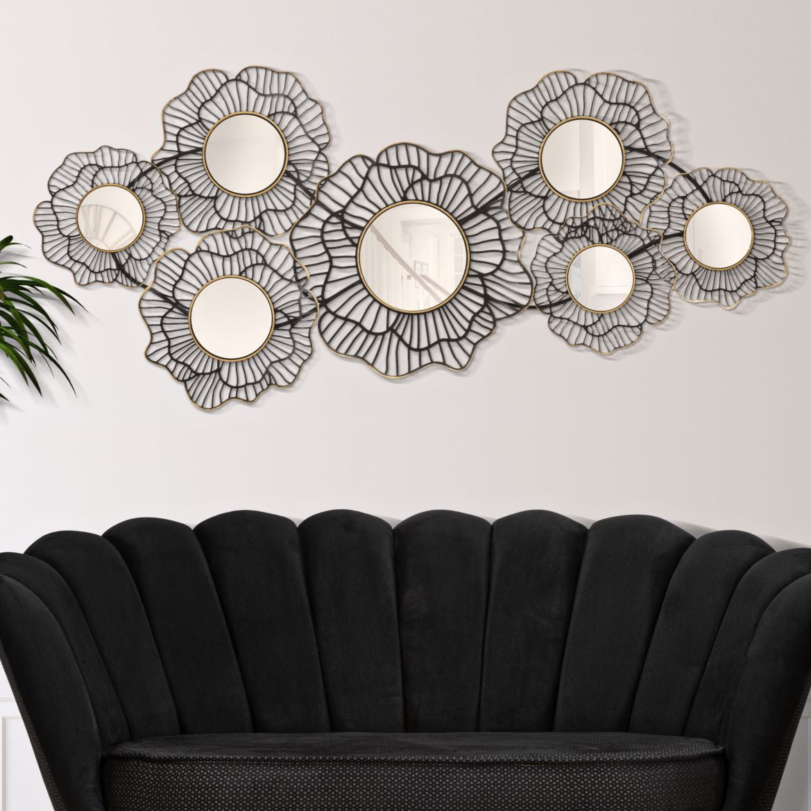 PANNELLO IN FERRO OSAKA C/SPECCHI - Pannello decorativo 3D da parete composto da fiori dalle linee semplici impreziositi da specchietti rotondi.