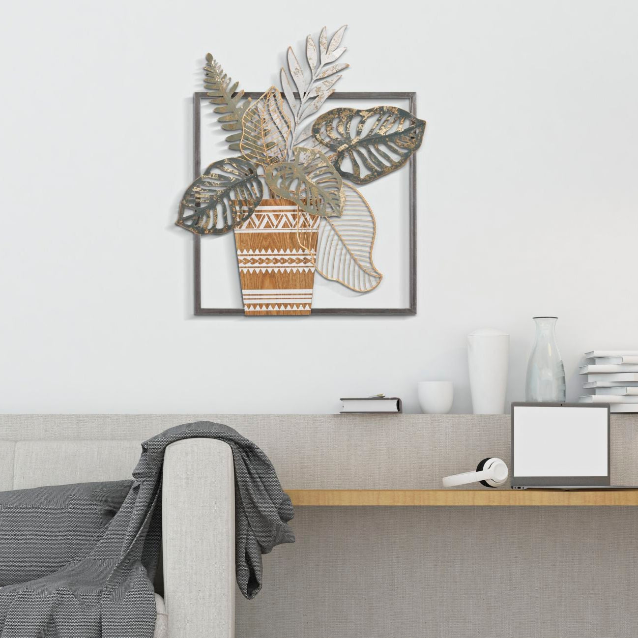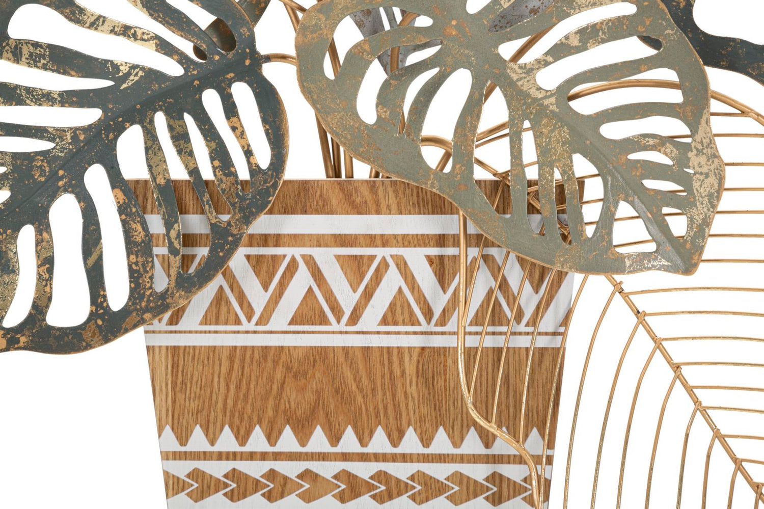 Le diverse texture e i dettagli in rilievo donano tridimensionalità e profondità, creando un effetto naturale e al tempo stesso artistico. La cornice geometrica racchiude un vaso con motivi etnici e una composizione di foglie nei toni dell’oro, verde e bianco, perfetta per chi ama un design fresco e contemporaneo.
