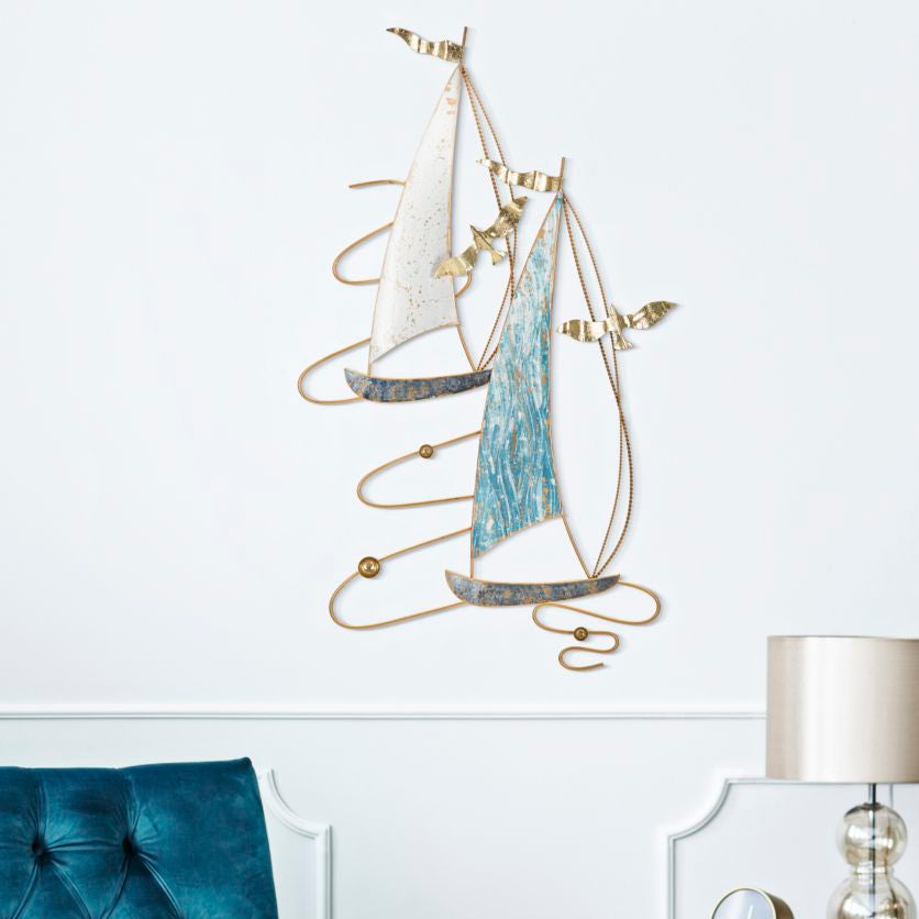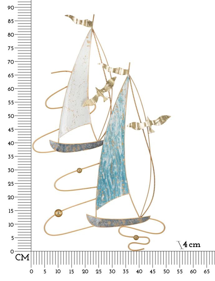 Un elegante pannello murale che raffigura due barche a vela con vele bianche e azzurre, arricchite da gabbiani dorati in volo. Realizzato in metallo con dettagli curati, porta in casa la freschezza e la libertà del mare.