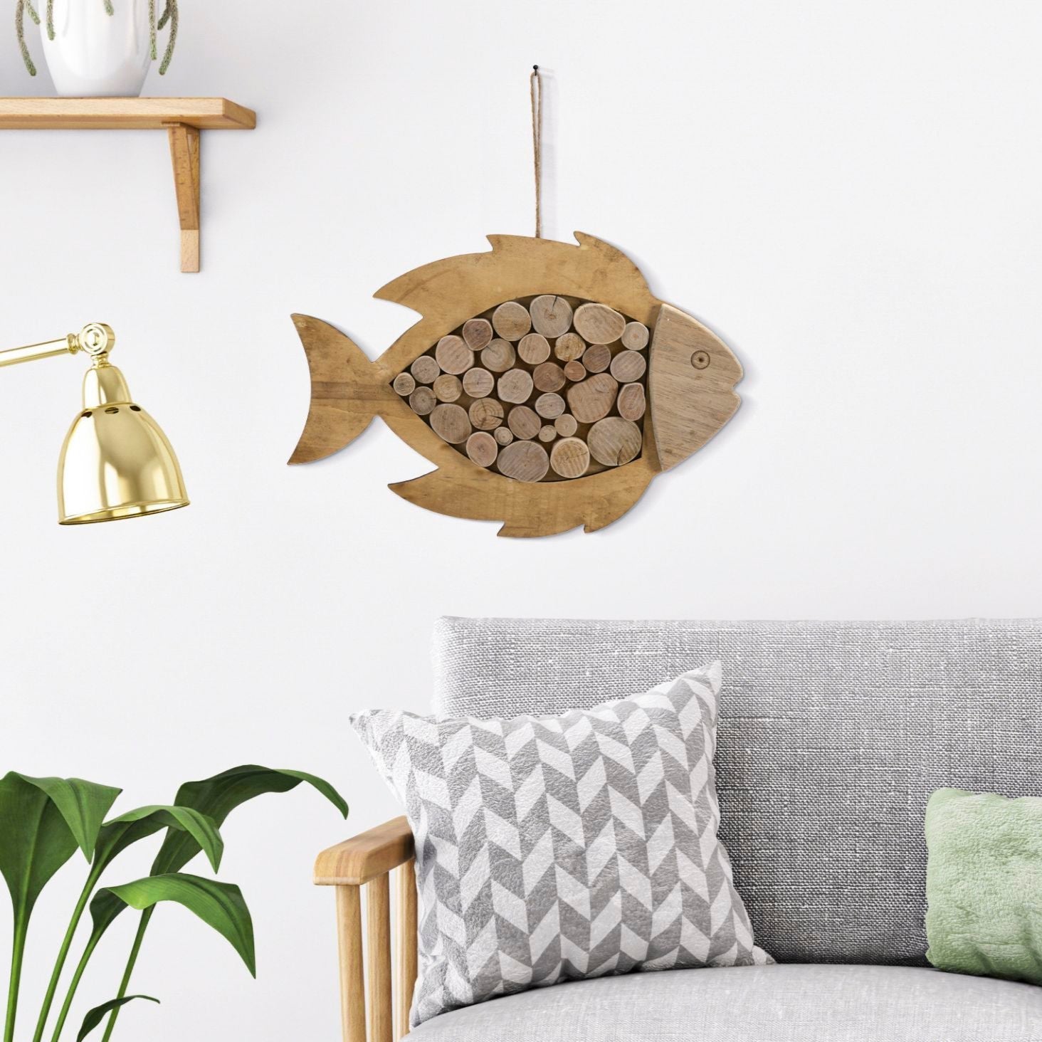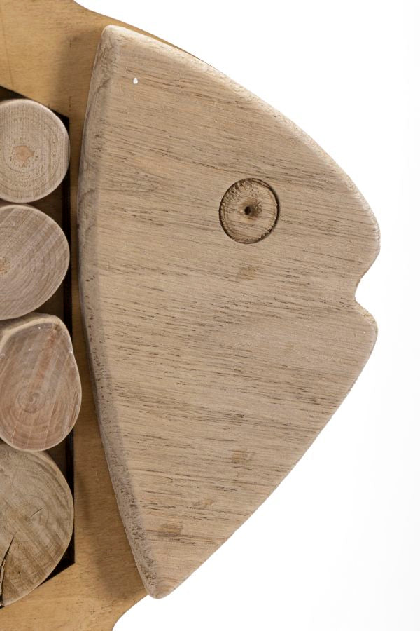 Scultura da appendere a forma di pesce composto da una serie di applicazioni rotonde in legno.