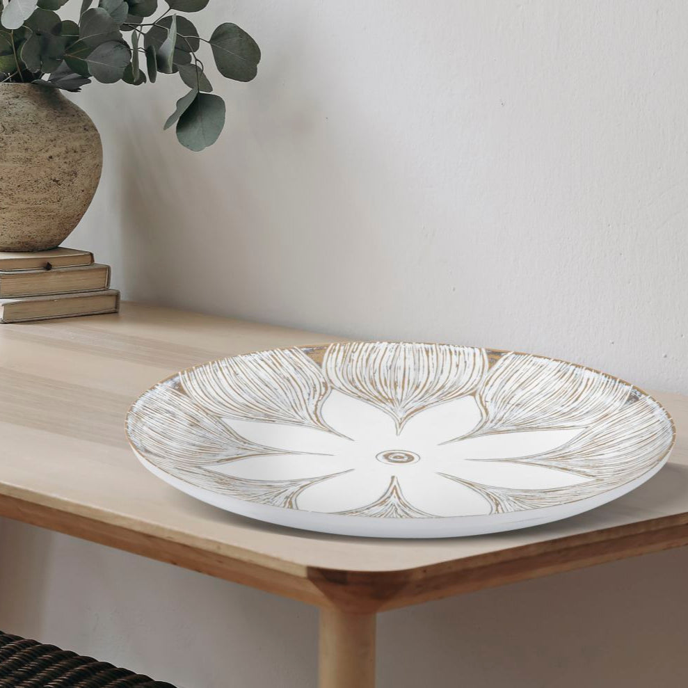 Piatto portaoggetti rotondo impreziosito da eleganti intagli che vanno a formare un fiore.