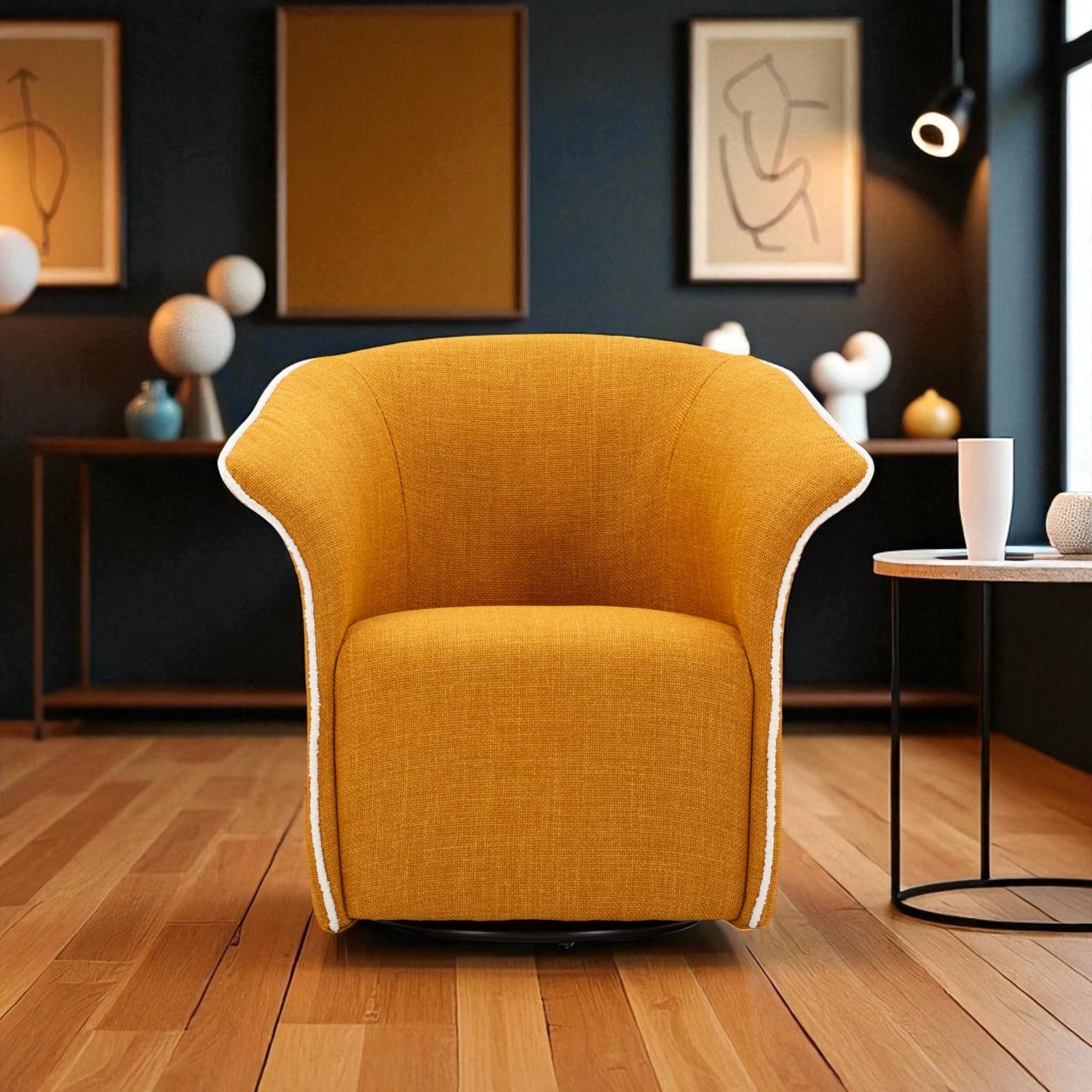 La Poltrona Girevole Siena Senape unisce comfort ed eleganza. Il design avvolgente, il rivestimento in tessuto senape e il bordo decorativo la rendono perfetta per ambienti raffinati. La base girevole aggiunge funzionalità e versatilità, ideale per spazi glamour e moderni.