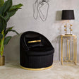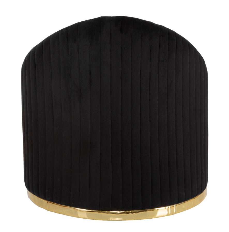 POLTRONA SPACE PLUS NERA - Elegante poltrona rotonda in tessuto imbottito, con schienale, dalle linee semplici e moderne impreziosita da una elegante decorazione dorata sulla base. Completa di cuscino con decoro geometrico dorato.