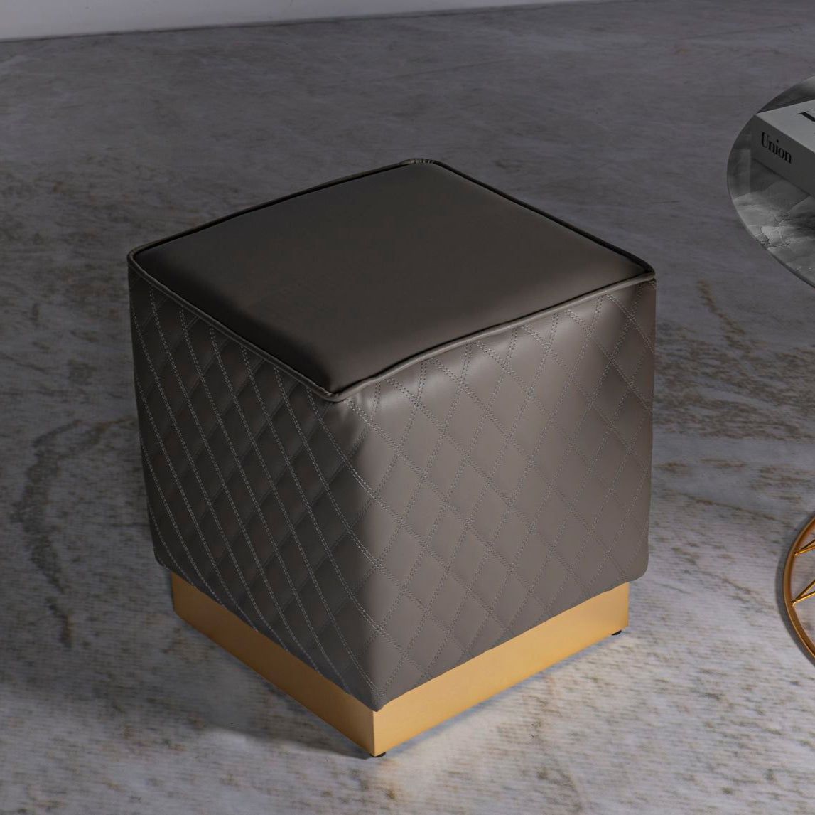 Puff quadrato marrone trapuntato in simil pelle con base oro aggiunge un tocco di luminosità a qualsiasi spazio.