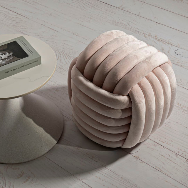 Pouf annodato in velluto rosa invita al relax con una sensazione accogliente e una nota di eleganza vibrante.