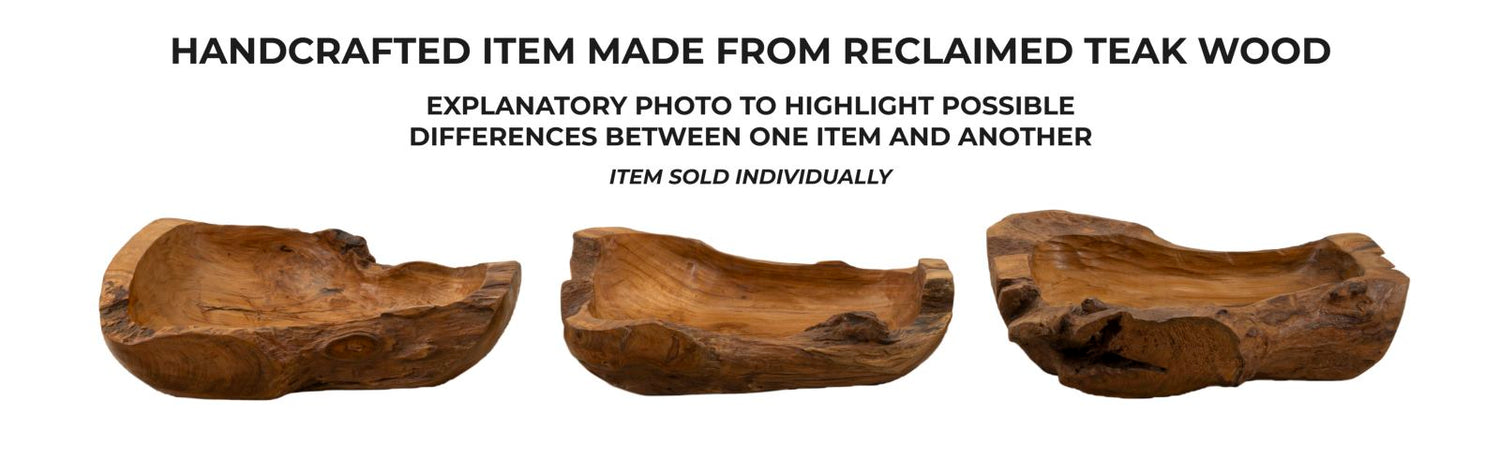 Svuotatasche dalle forme irregolari in teak riciclato, realizzato a mano, che unisce eleganza e calore naturale. Ogni pezzo è unico, con una texture accogliente che trasforma il legno in un tocco di autenticità e raffinatezza.