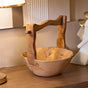 Elegante svuotatasche in teak riciclato, con la forma di un cesto e un manico artigianale. Unisce sostenibilità e raffinatezza in un pezzo unico e funzionale.