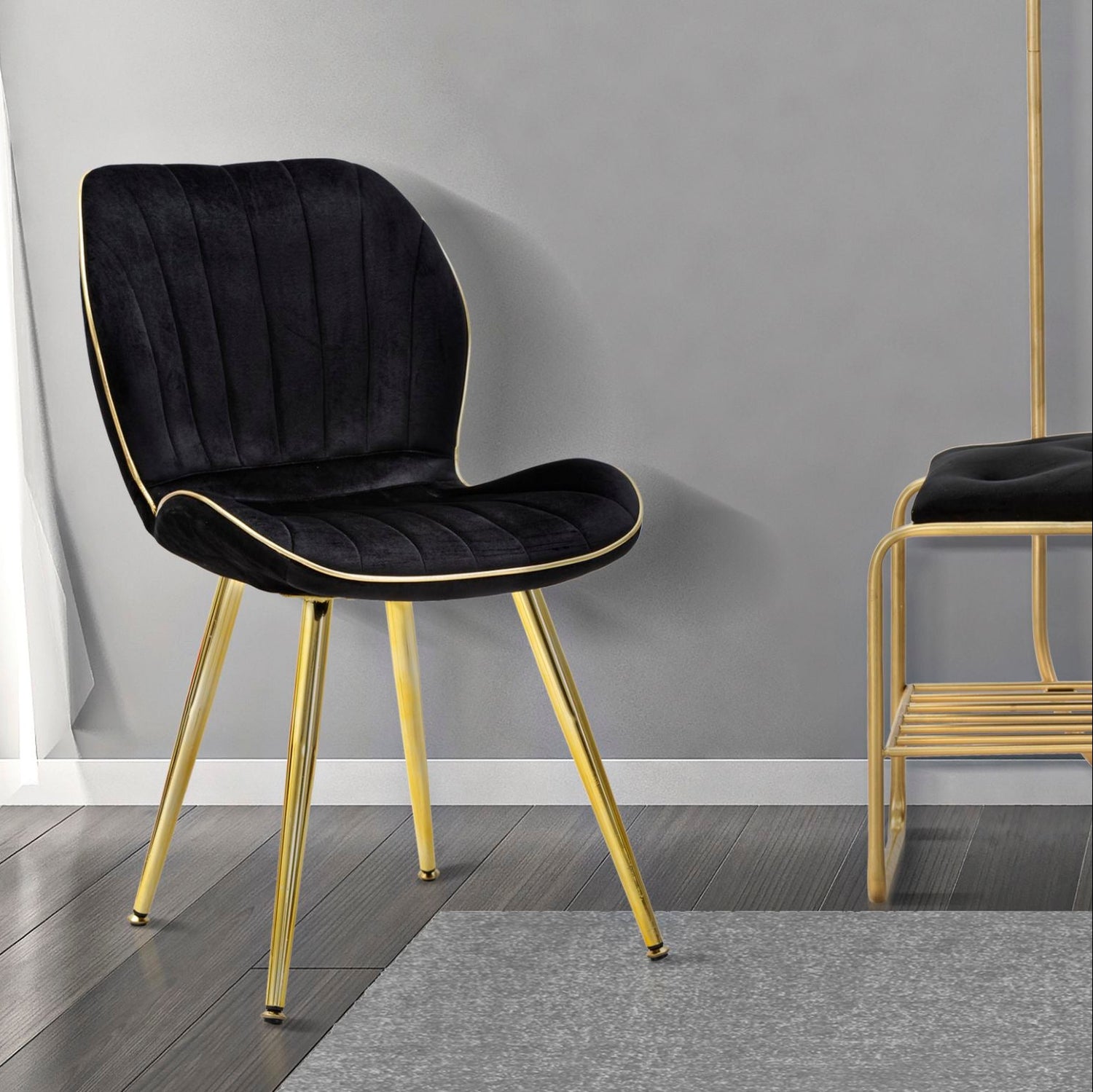 SEDIA PARIS SPACE NERA /GOLD SET 2 PZ - Coppia di sedie imbottite in velluto sintetico nero complete di comodo schienale. Le rifiniture dorate donano un tocco di luce e lo rendono un perfetto connubio tra eleganza e comodità.