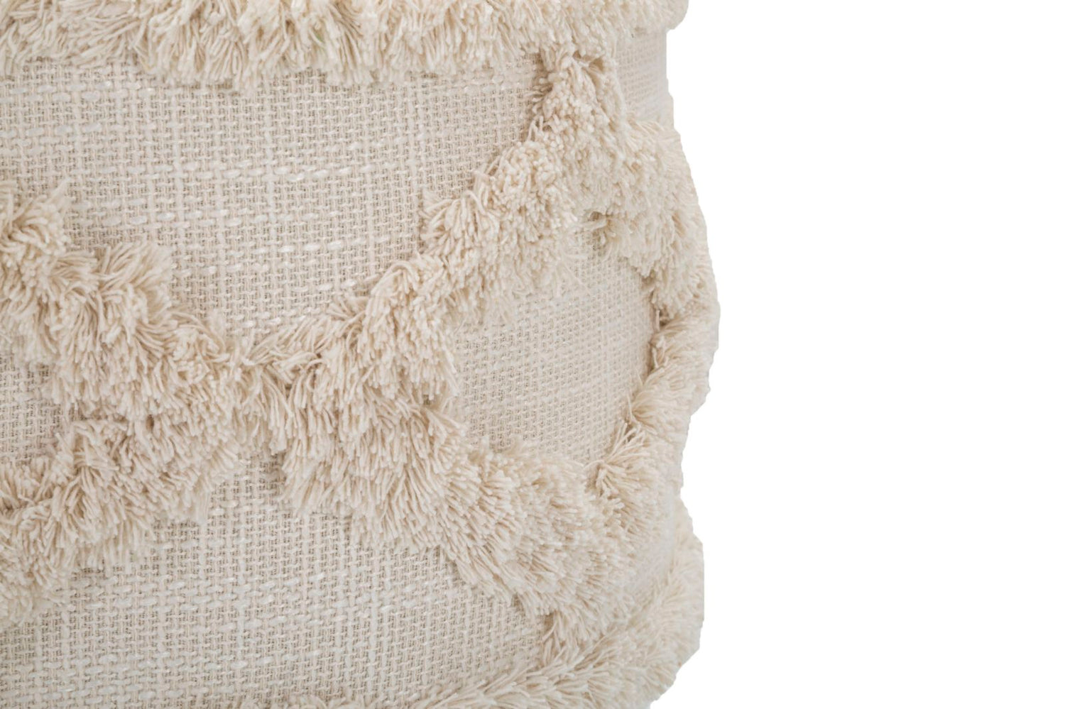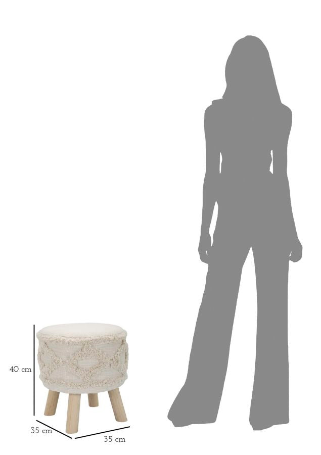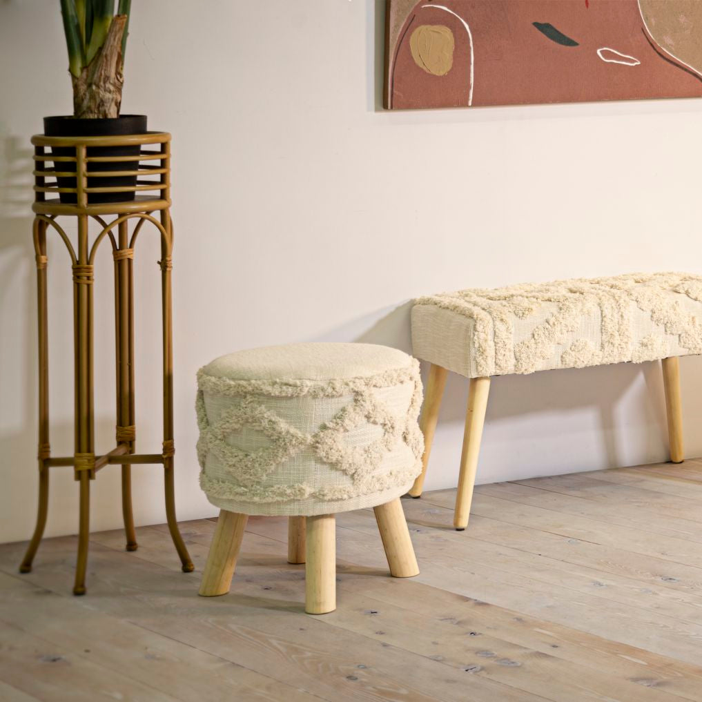 Un complemento d’arredo versatile e di tendenza, ideale come seduta aggiuntiva, poggiapiedi o semplice elemento decorativo. Rivestito in tessuto beige con motivo geometrico in rilievo, dona calore e personalità agli ambienti moderni e boho chic.