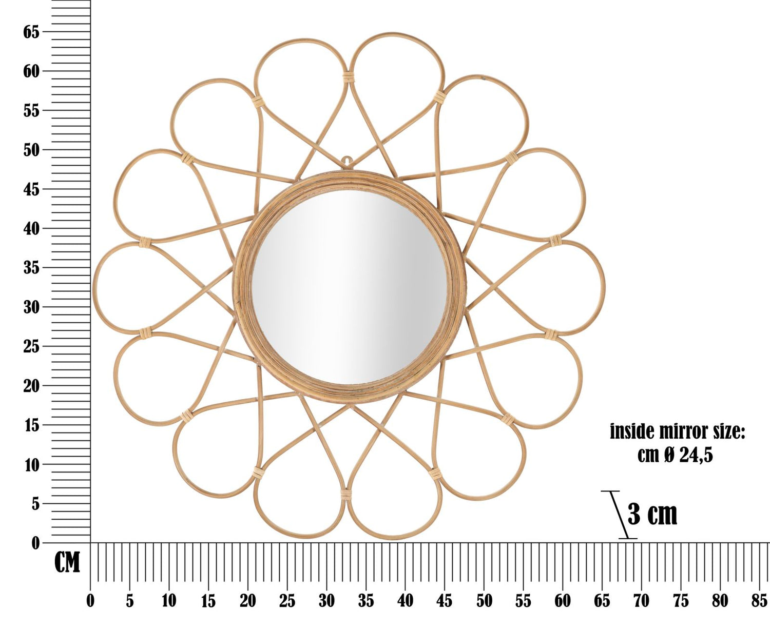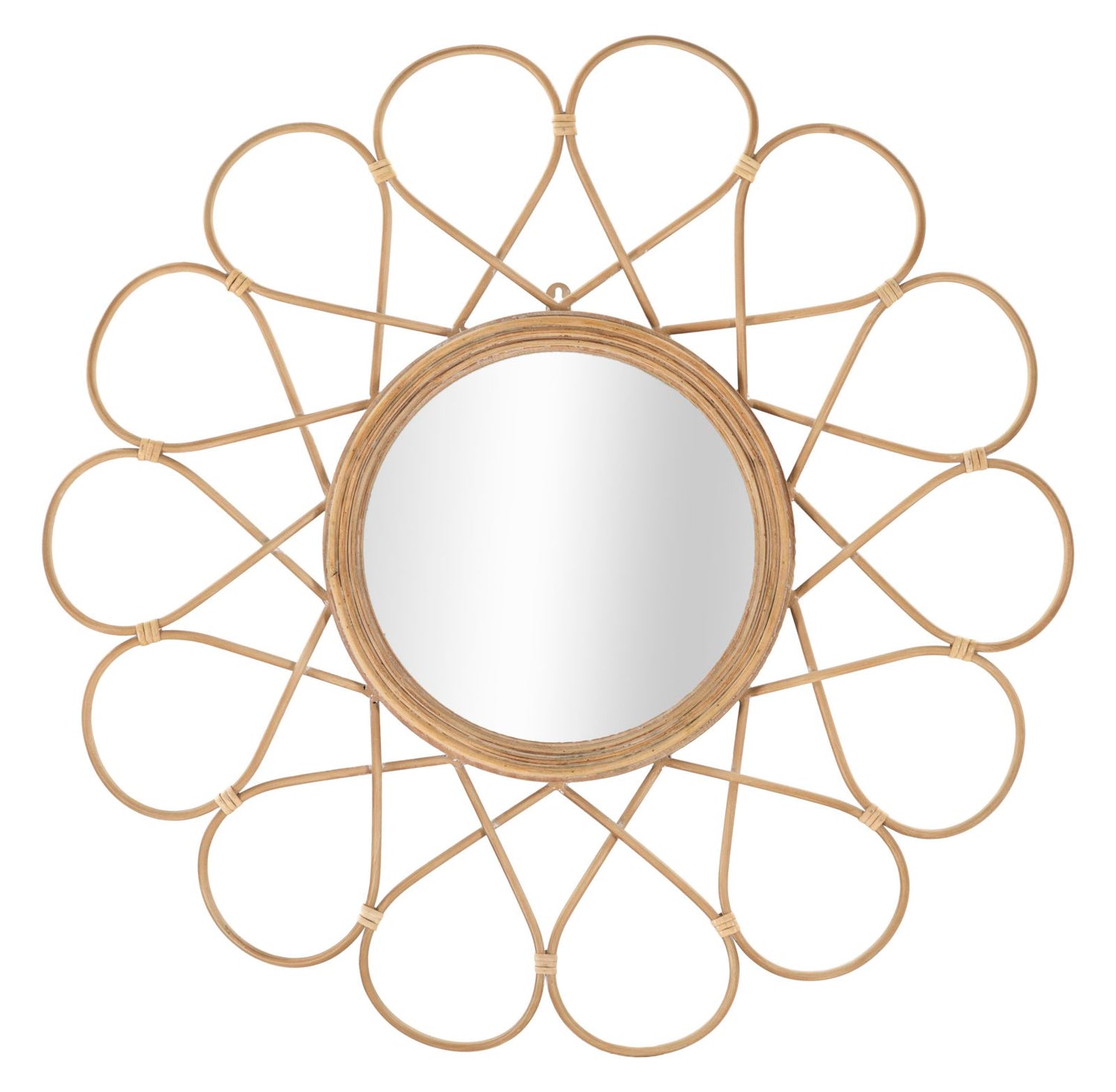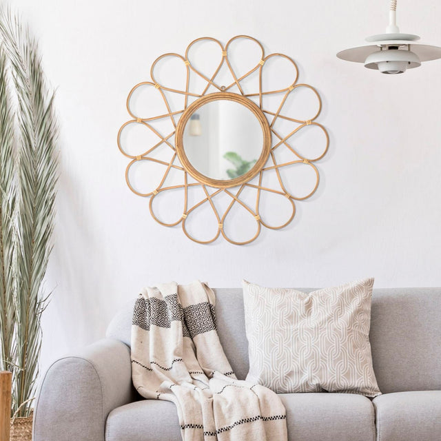 Uno specchio che unisce funzionalità e stile, con una cornice in rattan intrecciato a forma di petali che richiama la bellezza della natura. Perfetto per arredare spazi in stile boho, scandinavo o shabby chic, porta luminosità e leggerezza in ogni ambiente.