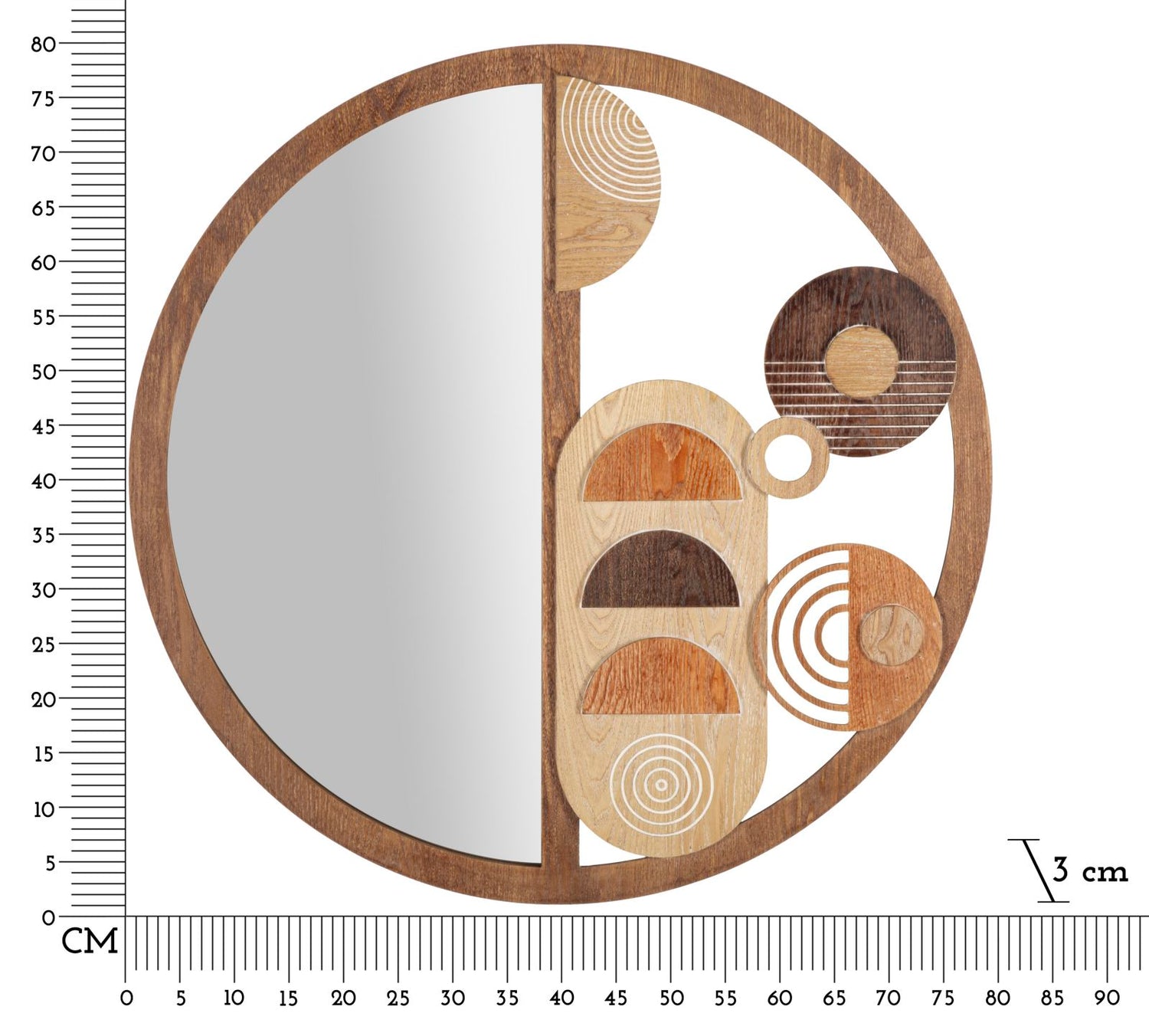 Specchio rotondo da parete impreziosito da un elegante composizione di parti in legno di varie forme e colori.