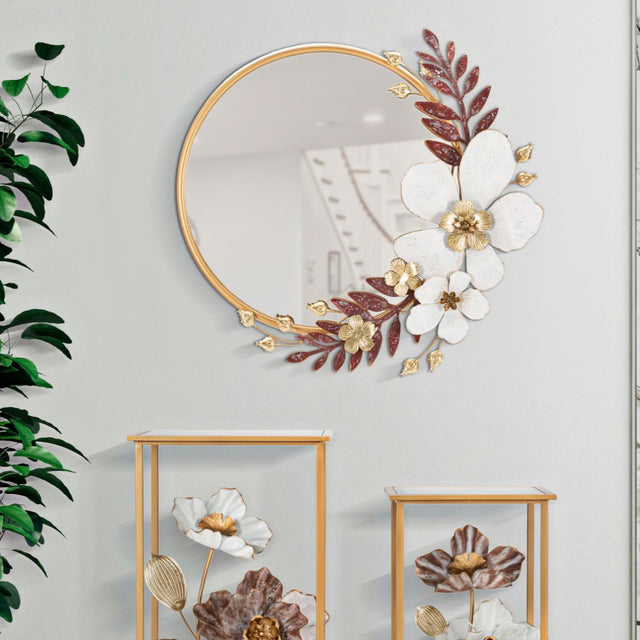 Un complemento d’arredo sofisticato che unisce la luminosità dello specchio al fascino dei dettagli floreali. Questo specchio tondo presenta una cornice dorata impreziosita da fiori bianchi e foglie rosso-brunite in metallo, creando un effetto romantico e scenografico.