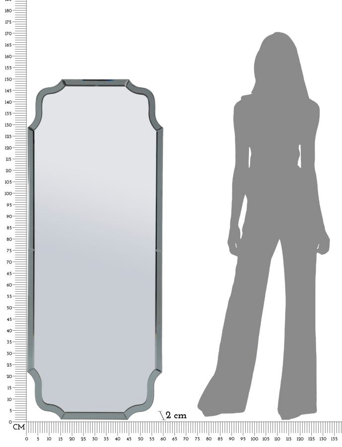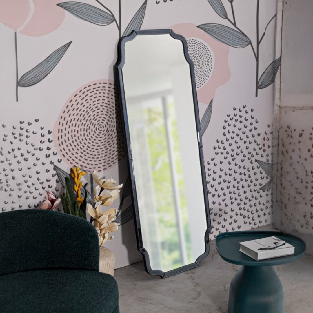 Questo specchio da terra o parete presenta una cornice sagomata con profilo bisellato, che riflette la luce creando un effetto sofisticato e luminoso. Perfetto per camere da letto, ingressi o cabine armadio, dona profondità e stile a qualsiasi ambiente, adattandosi sia ad arredi moderni che classici.