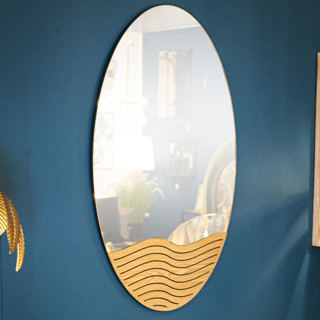 Un connubio perfetto tra linee morbide e materiali naturali. Questo specchio ovale è impreziosito da una base in legno con incisioni ondulate, che richiama l’armonia delle forme naturali e conferisce un tocco di calore e design all’ambiente. Perfetto per ingressi, camere da letto o bagni, dona luminosità e stile agli spazi contemporanei.