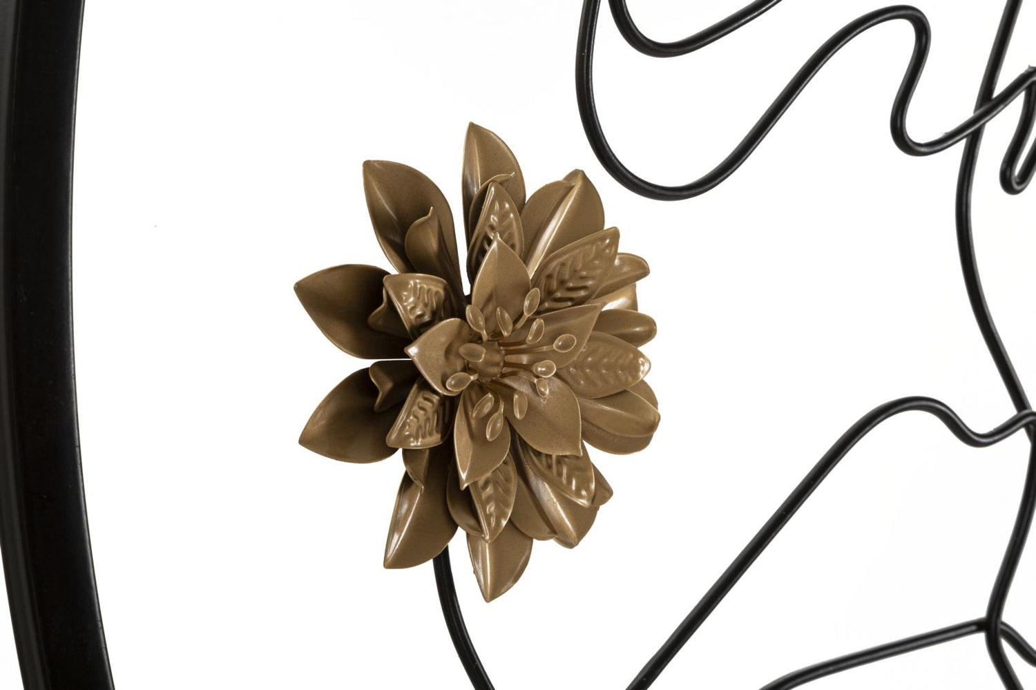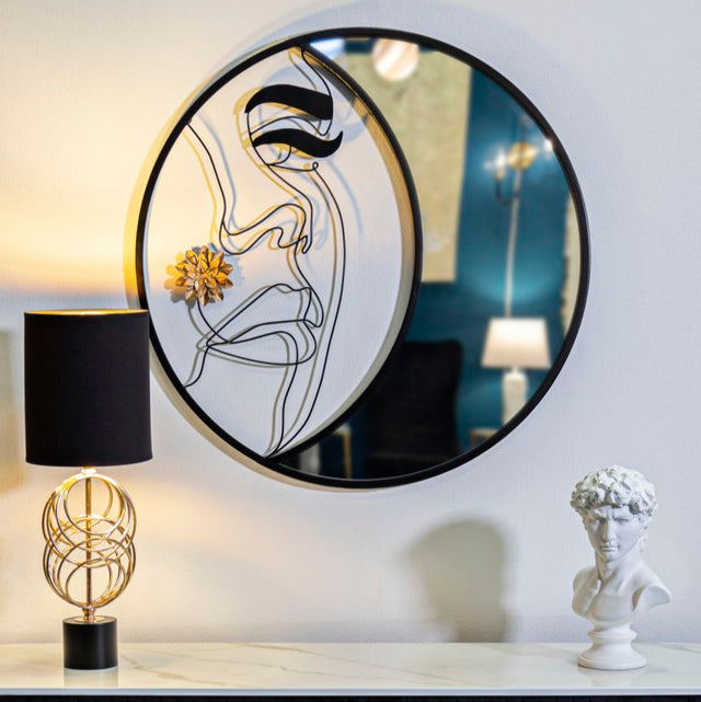 Un complemento d’arredo unico che unisce arte e riflessione. Questo specchio rotondo presenta una struttura in metallo nero con volto stilizzato in filo metallico e un elegante fiore dorato in rilievo, creando un equilibrio tra minimalismo e carattere. Perfetto per ingressi, soggiorni o camere da letto, aggiunge un tocco artistico e contemporaneo a qualsiasi ambiente.