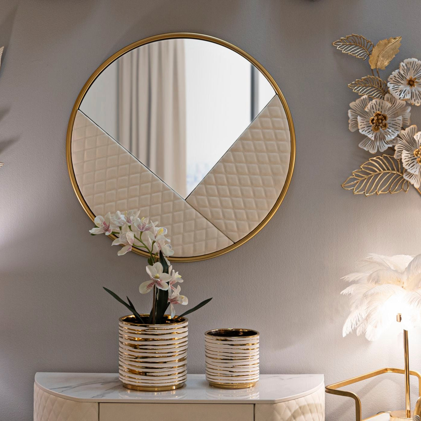 Specchio da parete con dettagli trapuntati in pelle; eleganza e dolcezza si fondono in un riflesso.
