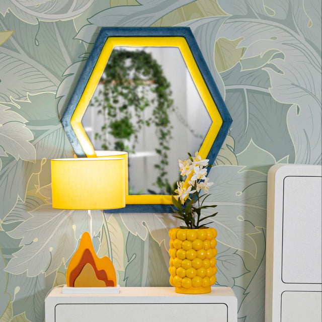 Un mix di colori e geometrie per chi ama l’originalità. Questo specchio dalla forma esagonale combina velluto giallo e blu petrolio, creando un contrasto moderno e vivace. Perfetto per ambienti giovanili o creativi, aggiunge personalità e colore a ogni parete.