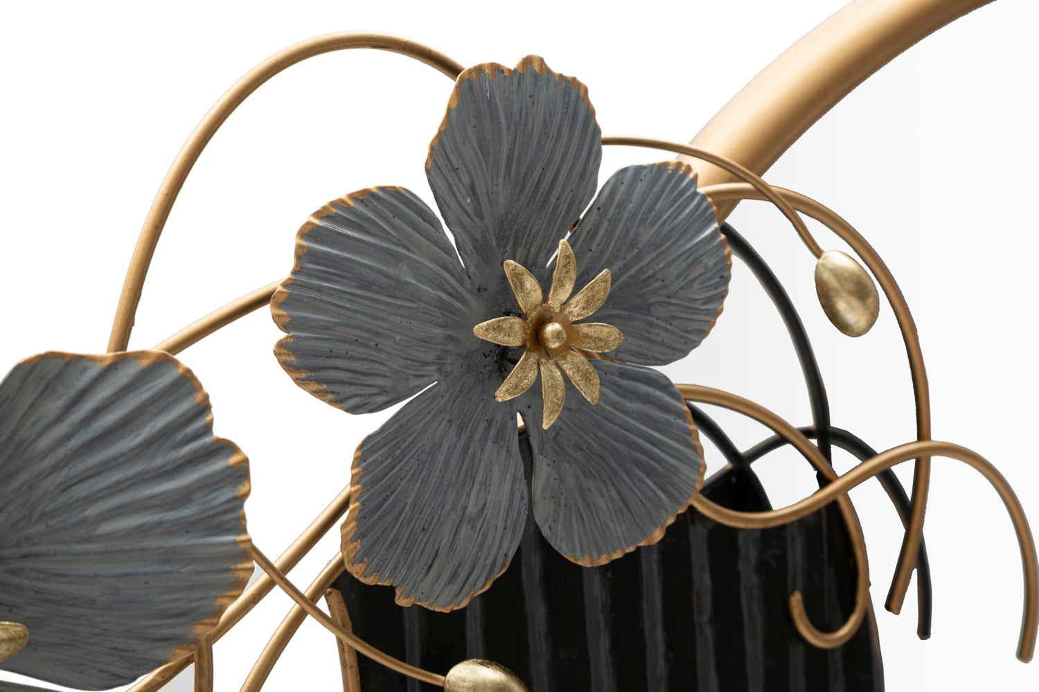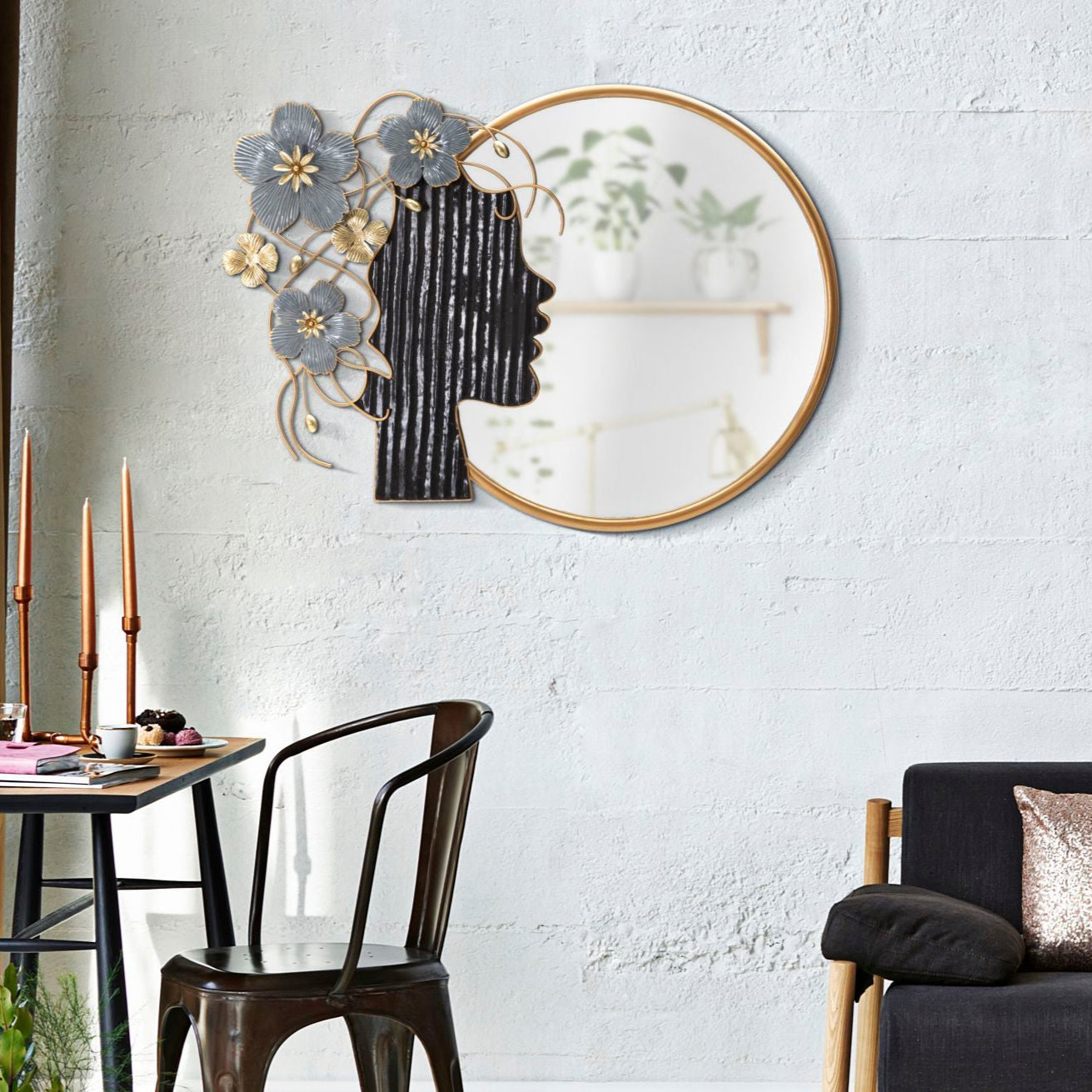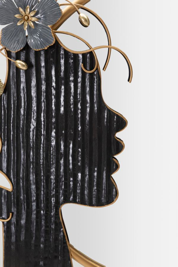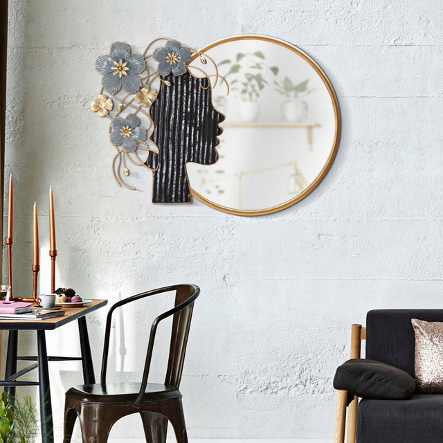 Un complemento d’arredo raffinato e artistico che unisce funzionalità ed eleganza. Lo specchio rotondo è incorniciato da una decorazione originale: un profilo femminile stilizzato in metallo nero con dettagli floreali in oro e blu, che donano un tocco unico e sofisticato alla parete.